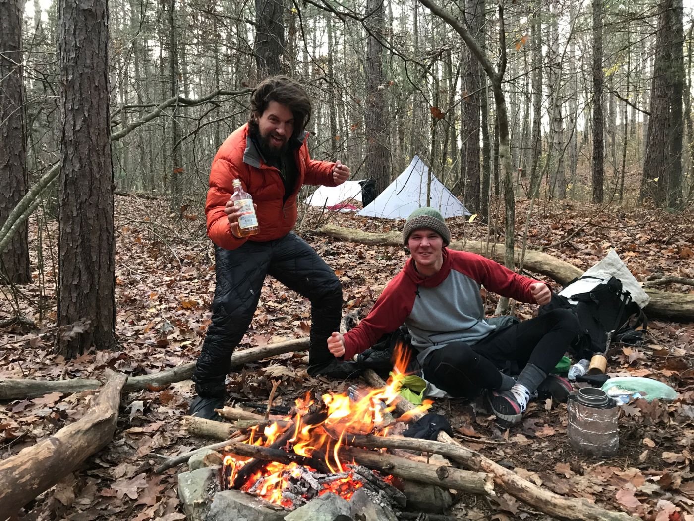We woke up with a smile, despite the howling wind that kept us up some of the night still working its icy touch. The sunrise greeted us and we set forth on Shenandoah Mountain Trail. Our Friday took us along attractive ridges and over Bother Knob, which our trail description noted as the highest point on the Great Eastern Trail at 4,344 feet. Reddish Knob was another treat, with full 360 degree views — though there was a road leading up to its summit and we got to say high to a few drivers in passing. Once done with most of that day’s road miles, we slipped down along the North River Trail and enjoyed its seven stream crossings and sunshine until we came out along another road and eventually found our camp for the night heading up to Tearjacket Knob, around 20 miles of hiking for the day. Friday night was cold and getting colder, unseasonably so for early November. We prepared for lows down into the low teens. We built a big fire, entertained ourselves with libations and humor, and emptied all of our water bottles before heading to bed. Knowing it would freeze, we just waited to fill up and treat the water from the river in the morning. Around that evening’s fire, Logan showcased his uncanny ability to draw all of the smoke and sparks his direction no matter which seat he took up around the fire ring.