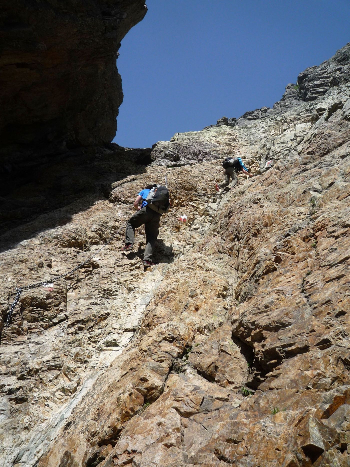 We were glad to begin the climb up, which featured a number of slabby walls in the 60-70 degree range. The moves were class 3, I suppose, but once you chain a dozen class 3 moves together on a slab like that, I’d call that class 4. I recall being very glad, very often, of my exceedingly limited rock climbing skill. Falling would not be good, so we took our time. There were few chains, but climbing up is way easier, and the rock was universally good. Towards the top, there is a chain, then one was out on the lip of the Col Perdue. We had done it!