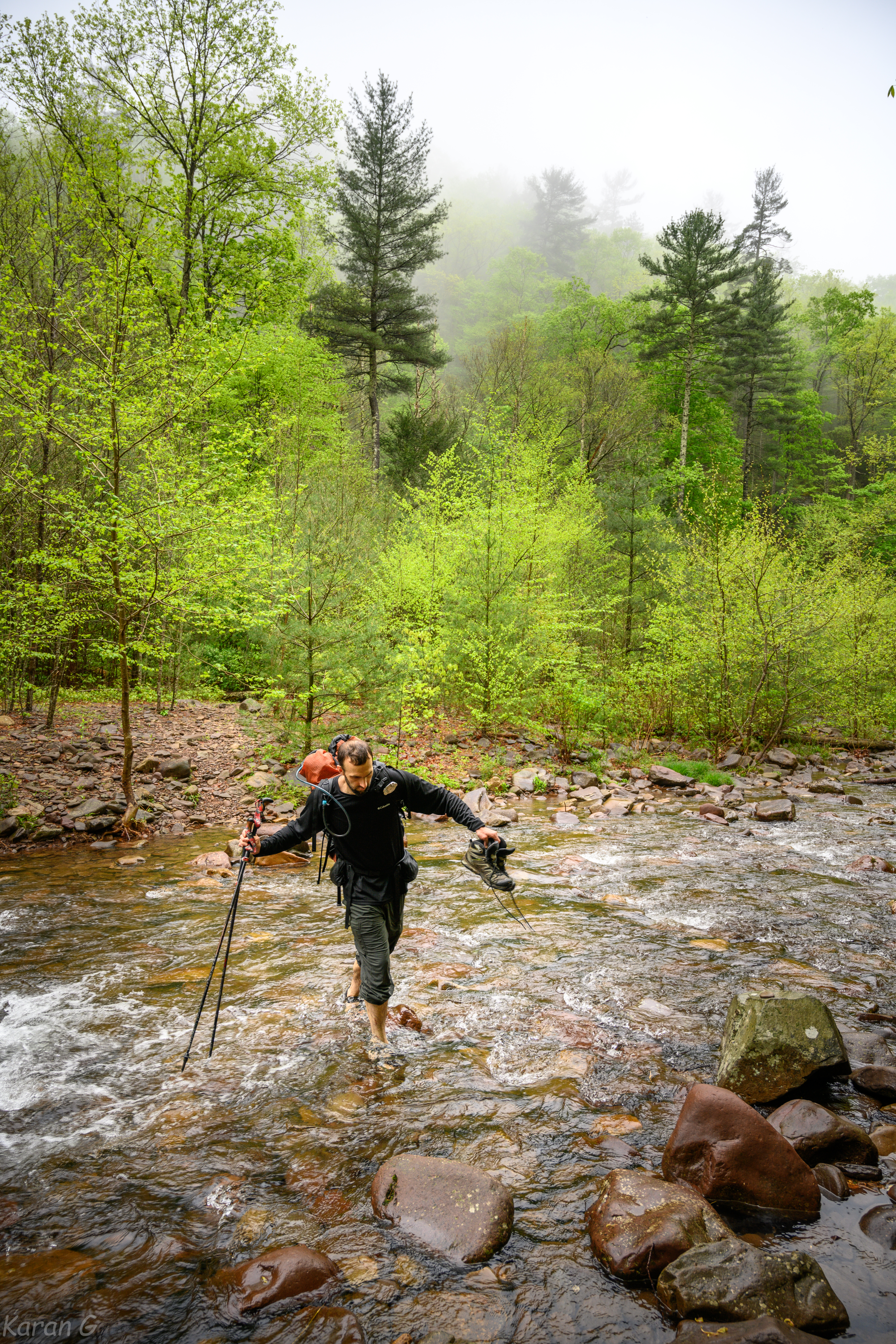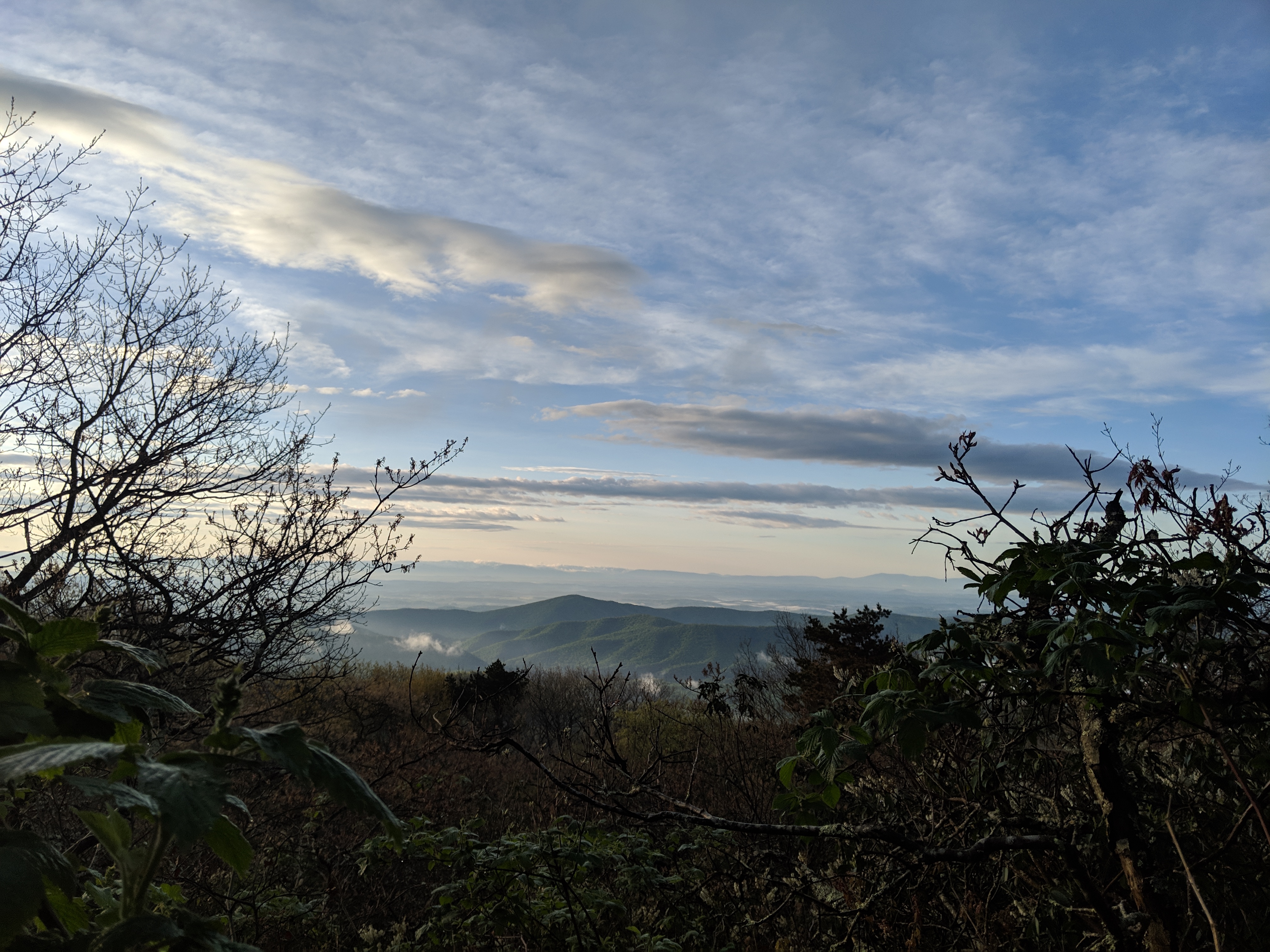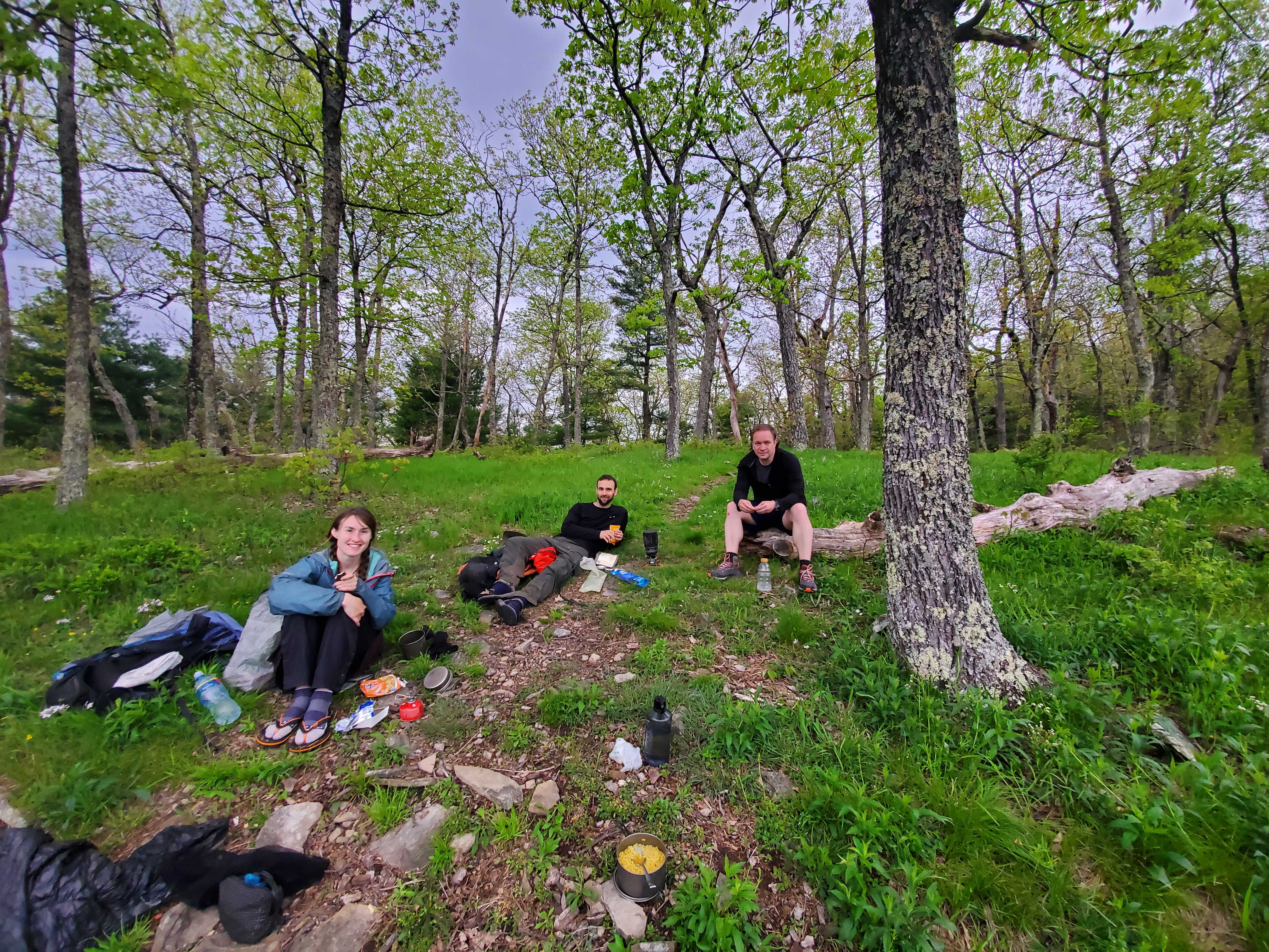 Logan, Karan, and I got to the campsite just past the Peak at 6:30 p.m. Bryan showed up shortly thereafter and confirmed that he had gotten turned around at the pond. It was a beautiful evening. We cooked by the overlook and watched the impending rain draw closer. The four of us scurried into our tents around 8 p.m. when it started to rain.