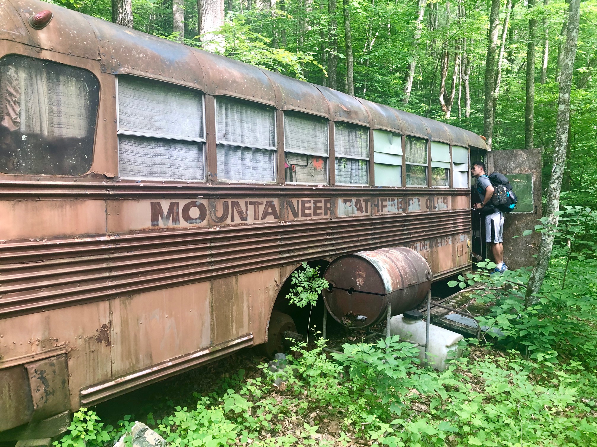 After that excitement, we moved along the trail, and arrived at the intersection with the North Fork Moormans River Road. From here, it was downhill to our campsite for the evening. The NFMR descends mildly from the AT, and occasionally widens up to allow our group to chat as we made our way down. I had told Michael to keep his eye out for an abandoned bus that I had heard could be seen from the trail. It turned out the bus was quite easy to spot, and James rather bravely peeked inside.