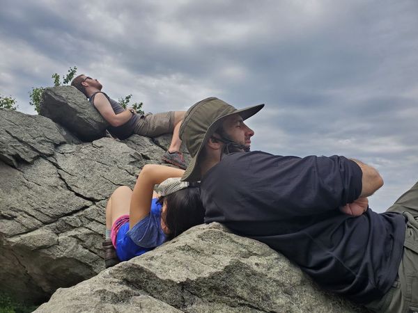 The hiker crowd thinned out after lunch. We took leisurely breaks during the afternoon to ensure we did not get to camp too early, including a nap on Chimney Rocks. We also played a challenging game of “pickles or ice cream.” Our break strategy worked: we got to camp around 5pm and set up at the large group site across the trail from the shelter. We also admired the privy, even though the doorbell and light switch were non-functional.