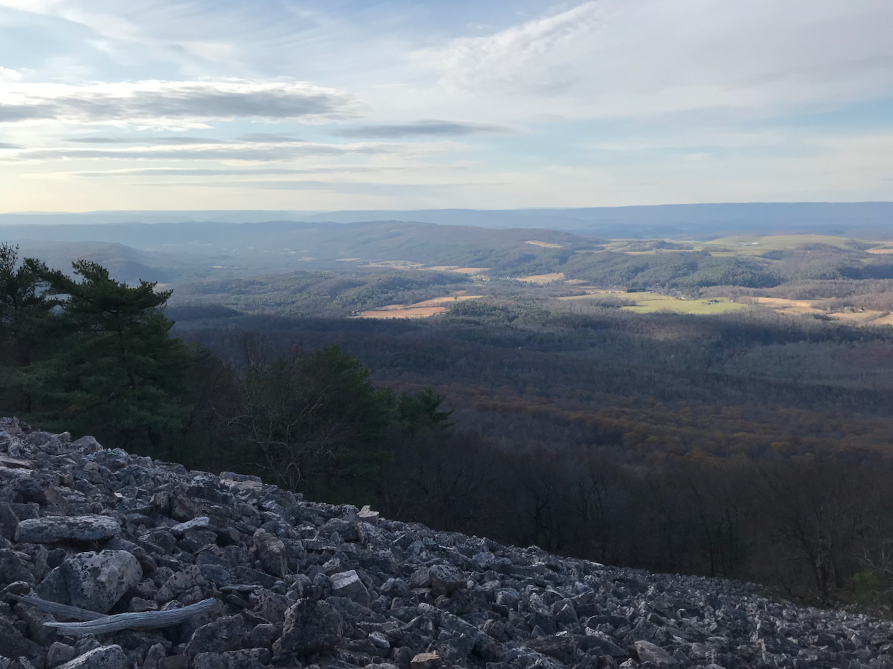 I passed the Dinkey House around sunset and proceeded by Mill Creek Quarry in the dark. There was a hint of light on the horizon that made for a spooky view as I made my way up to Shorbs Summit. After seeing the glinting eyes of nocturnal animals, including a possum and a deer, I started looking for a spot to camp. There were plenty of flat spots once I crossed into the southern part of Rothrock State Forest. I set up my tent in the dark, and Bryan arrived about an hour later. We both commented on how much harder it is to follow the trail in the dark, but once we were set up and fed, it was a comfortable night in the mid 30s F.