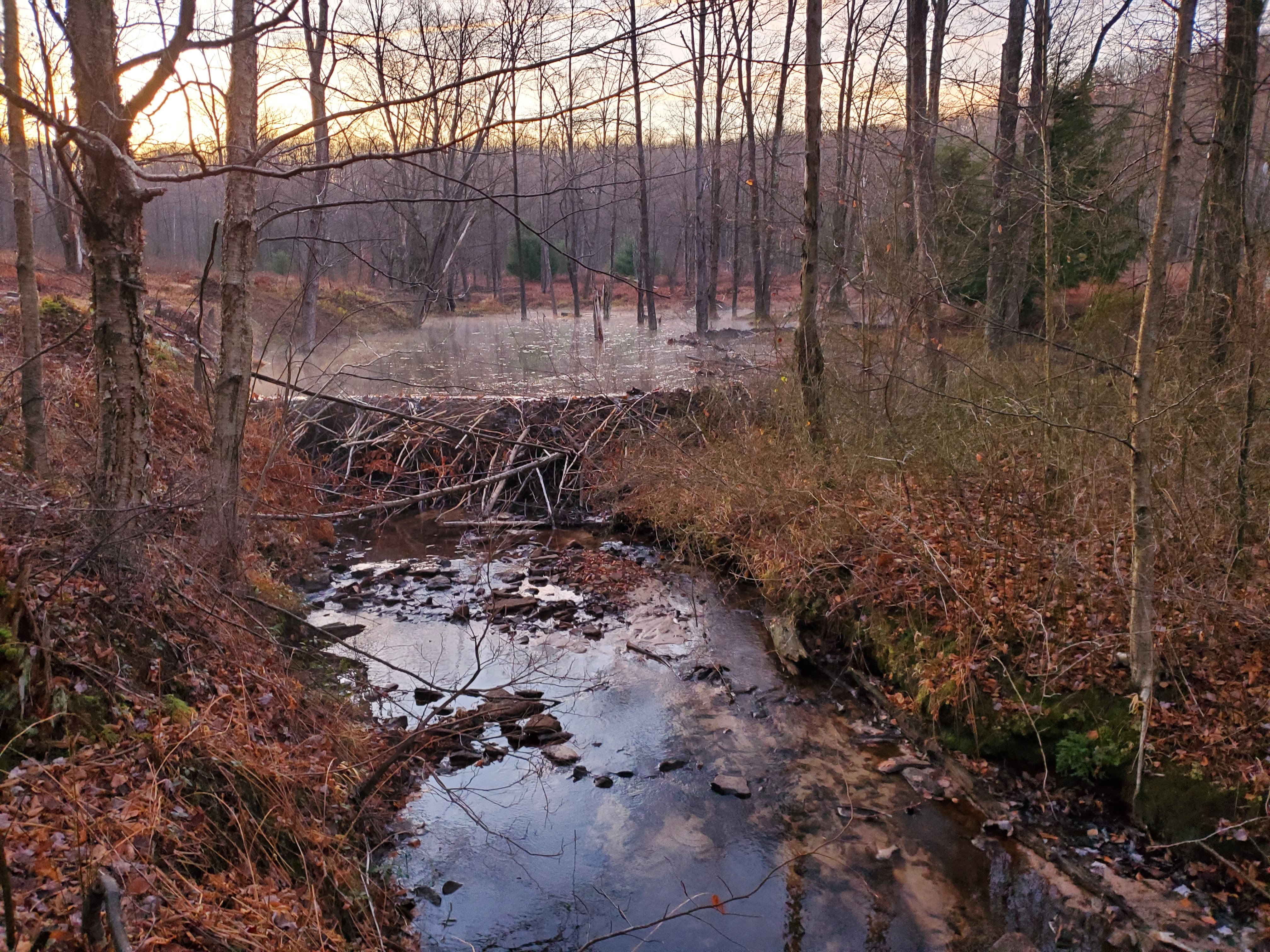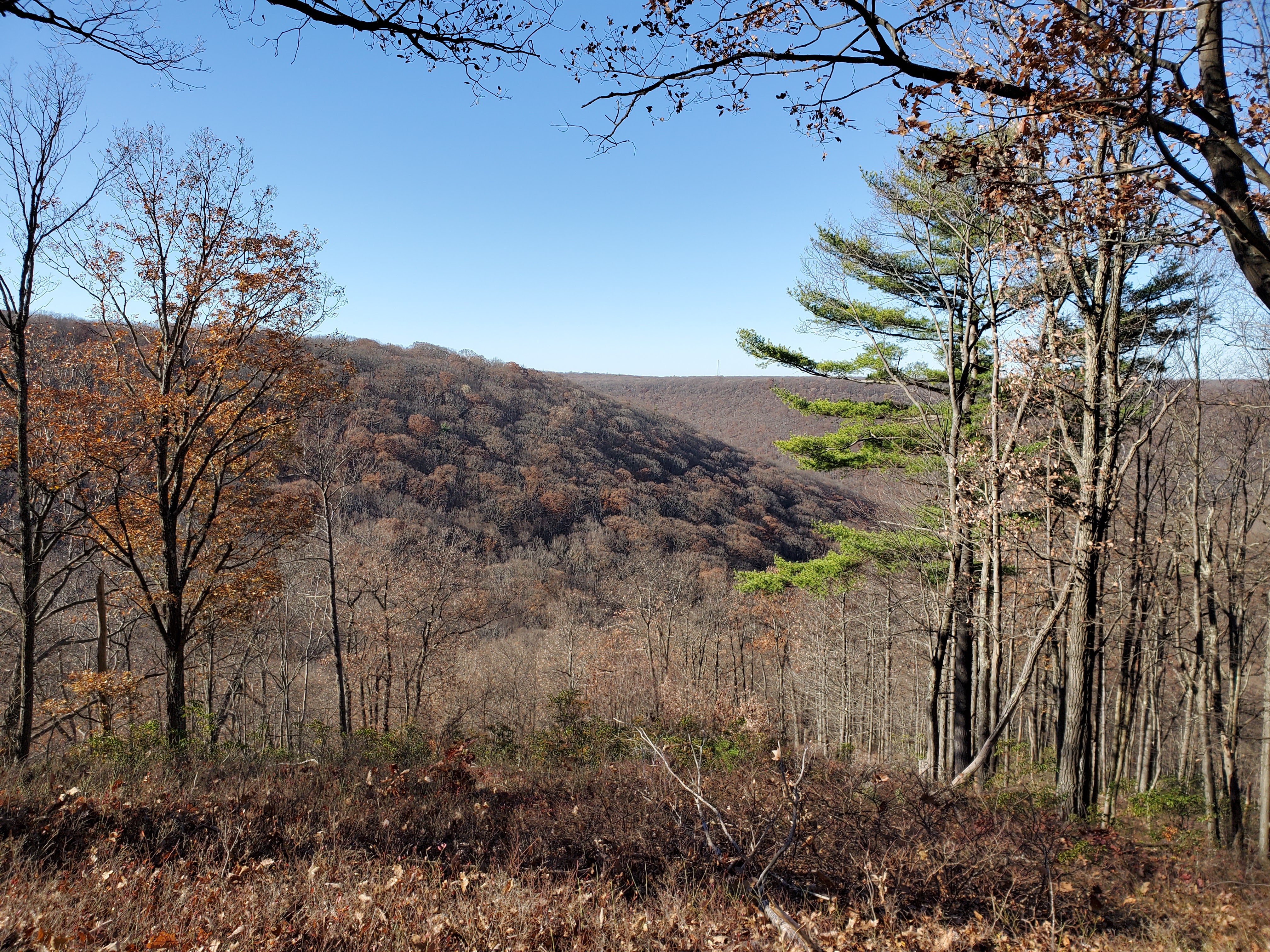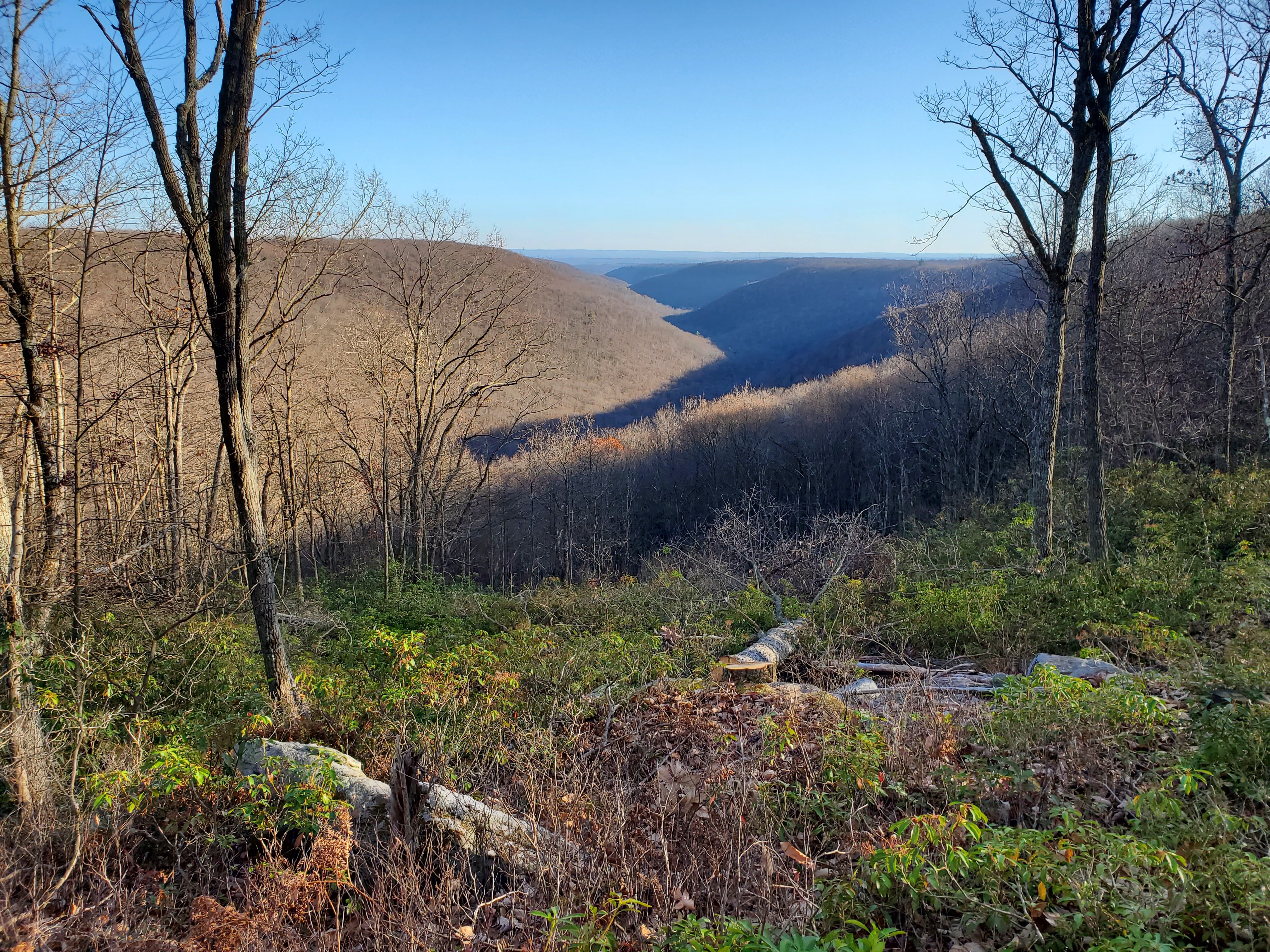 Folks were up and ready to hit the trail early the next day. Everyone confirmed hearing the coyotes yip and howl at night. At around 40-45 degrees, it was also our warmest night yet. The morning light backdrop against a dense patch of birch trees was really nice. We passed the large open field which was our backup campsite. The miles flew by initially, but we all felt that long climb out next to the Porcupine Draft. On a forest road, we passed by a hunter (we saw a few of them over the weekend). We passed by a view and then the trail shot straight down along Deible Run. The hike along Mix Run was really nice and populated with many small bridges over the run. We took our lunch break at a picnic table right next to a cabin. In general, we were all hiking at a pretty similar pace and it was nice to regroup every few miles.