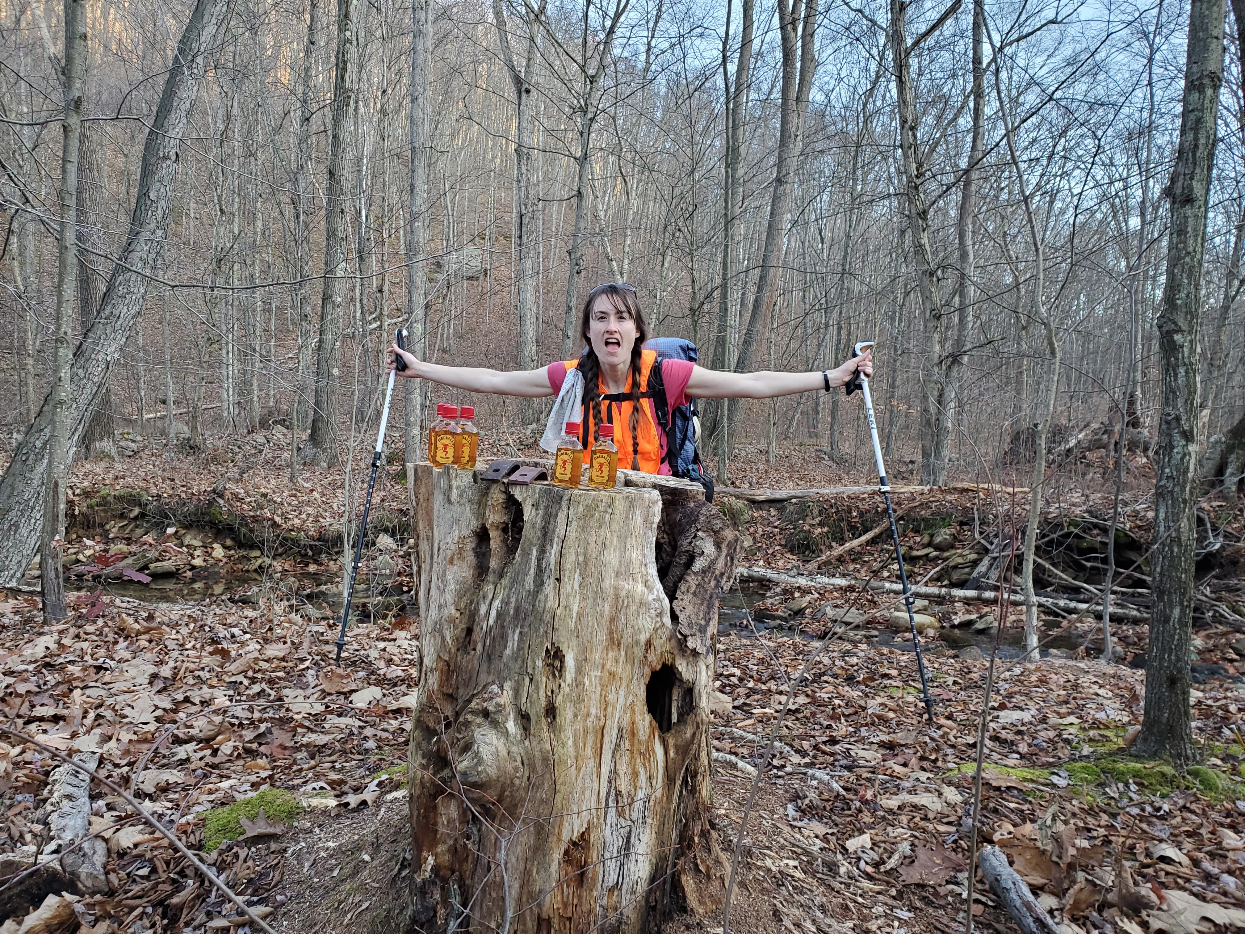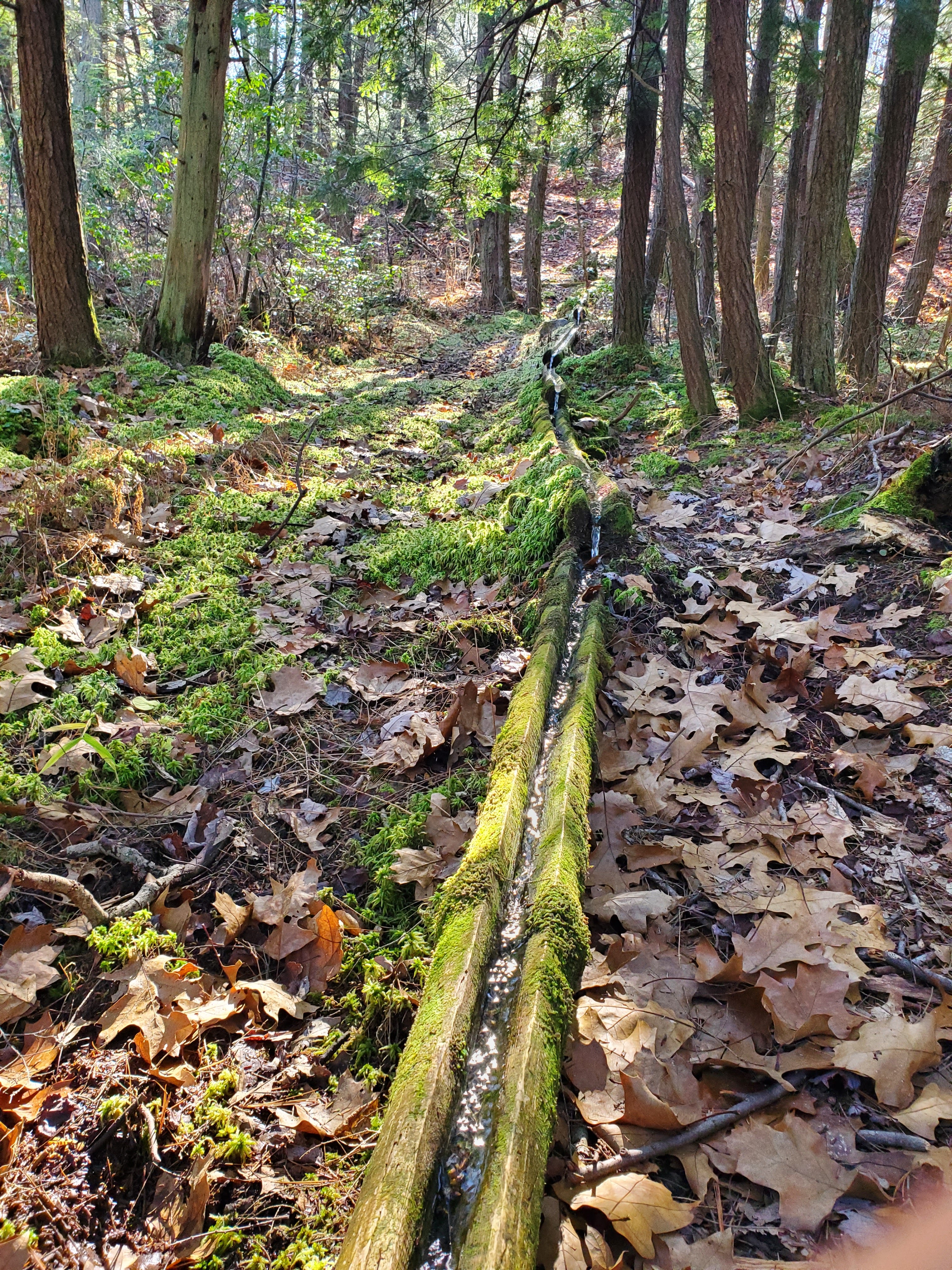 Again, we woke to near freezing temps in the morning, this time waking up to somewhat icy condensation on the shelters. We said our goodbyes and thanks to Jen and Marika. We warmed up immediately on the steep climb out of the valley and enjoyed some of the flat miles on the top. A steep descent led us to Upper Three Runs and the climb out through Laurel Swamp Draft was also steep and short. Atop, Kylie, DOC and I ran into a large group of horse riders near Three Runs Lookout Tower. Zak missed seeing the horses, but thought he heard something and was a bit disappointed to learn it wasn’t a wild animal. At the top of Lower Three Runs, we took a lunch break at a campsite next to the piped spring. I found the spring, which flows through artfully created nooks in laid, connected trees, surrounded by vibrant green moss, to be very beautiful.
