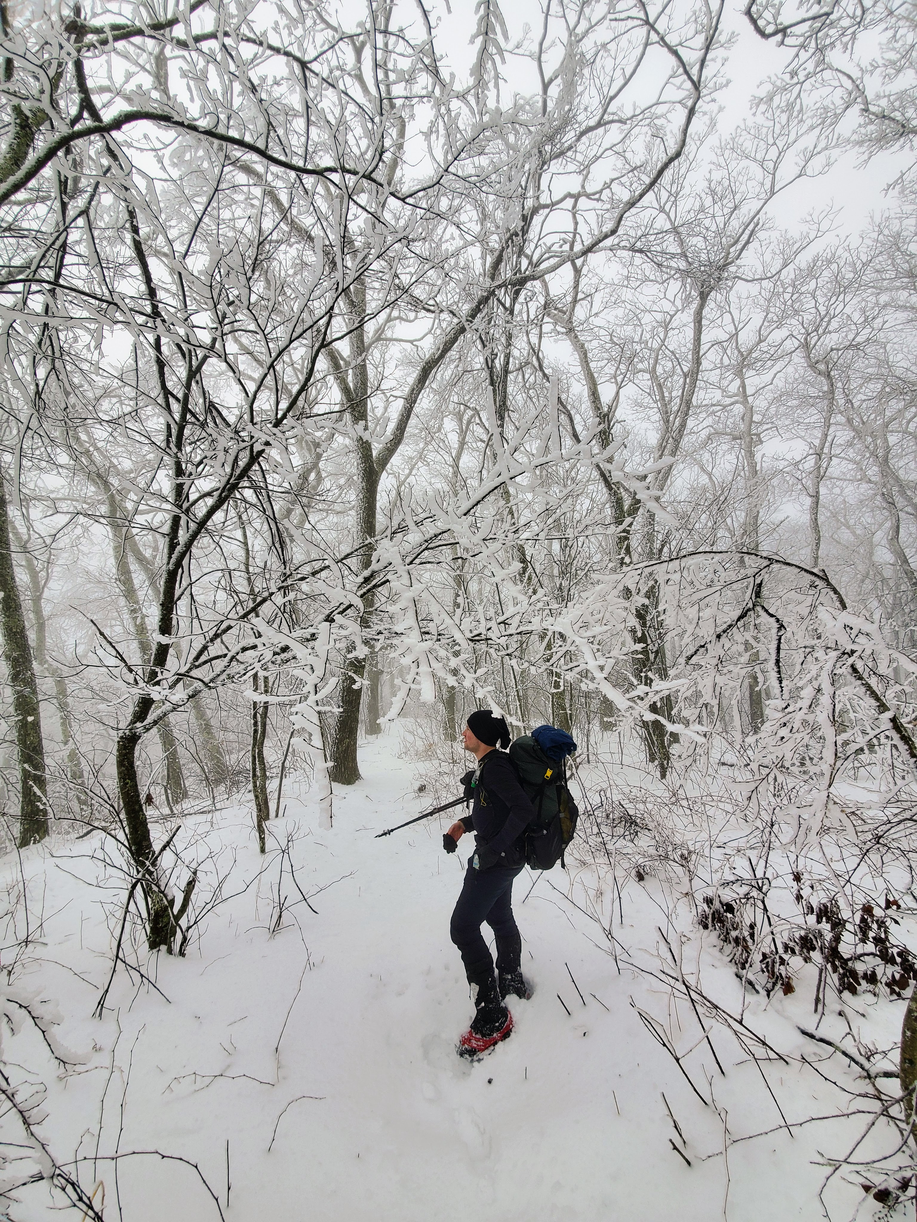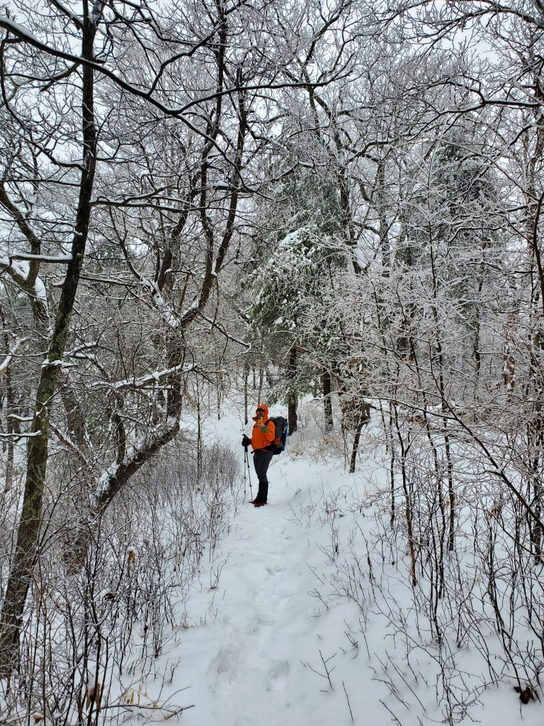 But, after this junction, those spots increased significantly and slowed us down to a crawl. They also resulted in visual barriers to finding where the trail was and often, it required us to consult our GPSs. Around The Pinnacle, we got off trail and endured some sidehilling before getting back on track. The Bald Ridge miles continued to drag on though and drew comparisons with ADK in terms of difficulty despite minimal elevation gain. Finally, after 5 hours of slogging, we reached The Peak after hiking only 7 miles. We knew that the trail would become easier after this point and it did. Once we turned on the Bridge Hollow trail, we were happy to be hiking freely at our normal 3 mph pace as the snow depth lessened and the ice on the trees disappeared. Unsurprisingly, we didn’t see a single person while we were out there. All of us felt that we did not miss out by being out one less day.