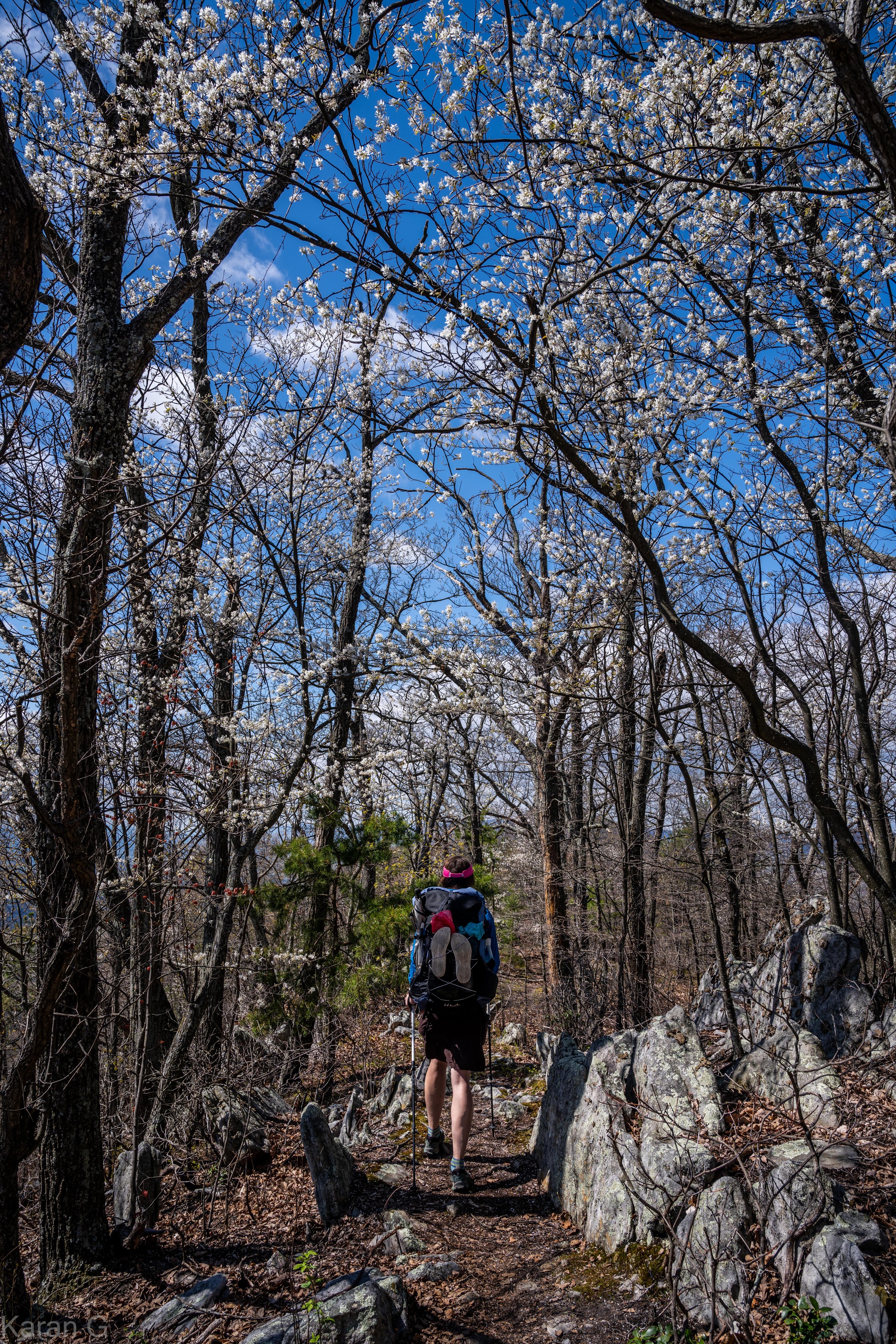 After a pleasant night with temps in the 40s, people hit the trail at various times in the morning. A gradual climb brought us back on the Eastern ridge. At ~15 miles, this is the longest ridge stretch on the Massanutten trail. The trail is relatively mild and there are plenty of trail junctions along it. The blooming flowers and the buds announced the onset of spring. At this time of year, one can easily see through the trees to catch glimpses of the Shenandoah ridgeline. Water Dog and David scoped out the panoramic views at Kennedy Peak.