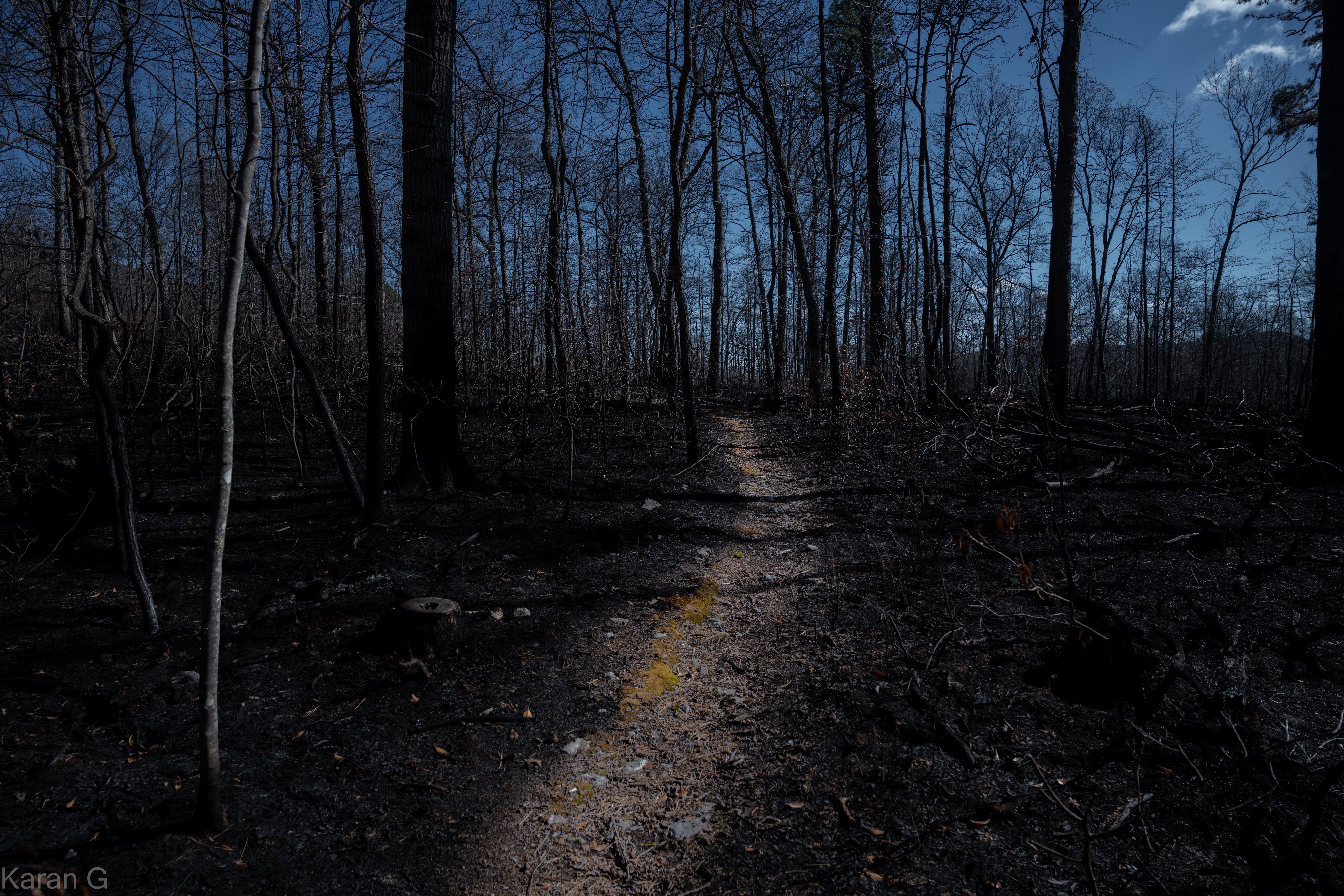 Onwards, we hiked on the rocky Jawbone Gap ridge. We ran into runners from the Happy Valley trail running group. After descending and crossing Moreland Gap road, it felt as if we were teleported to a different world. There was a controlled burn in this area recently. One could still smell the burn. The landscape on either side of the trail had blackened trees, but the trail was untouched. We wondered how this was achieved. Hiking here was pretty cool, it was as if we were walking through Mordor. One does not simply walk into the Massanuttens!