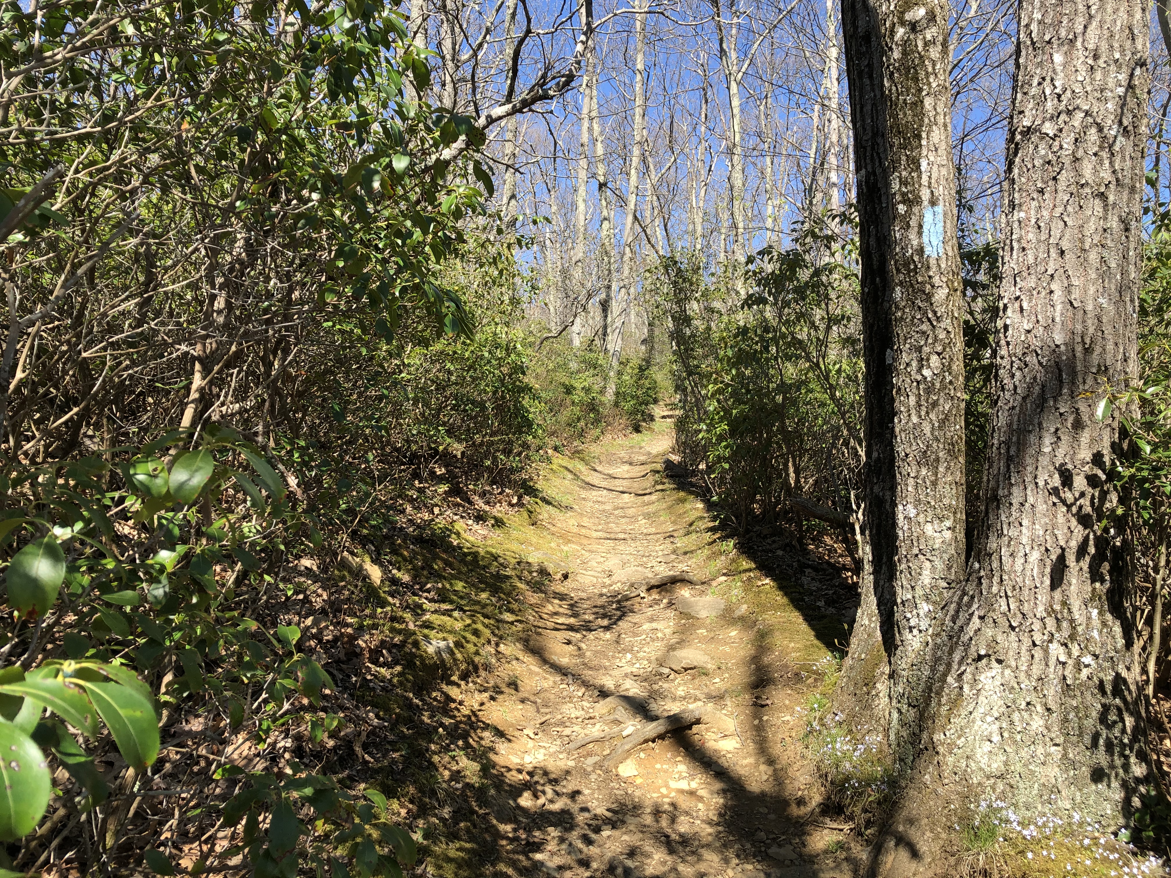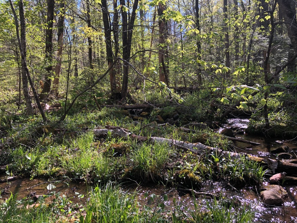 Up Buck Hollow we went. Tender new growth gave way to hardy mountain laurel and bare branches as we approached, then crossed, Skyline Drive and made our way up the Appalachian Trail. Even higher up, though, life was bubbling up.