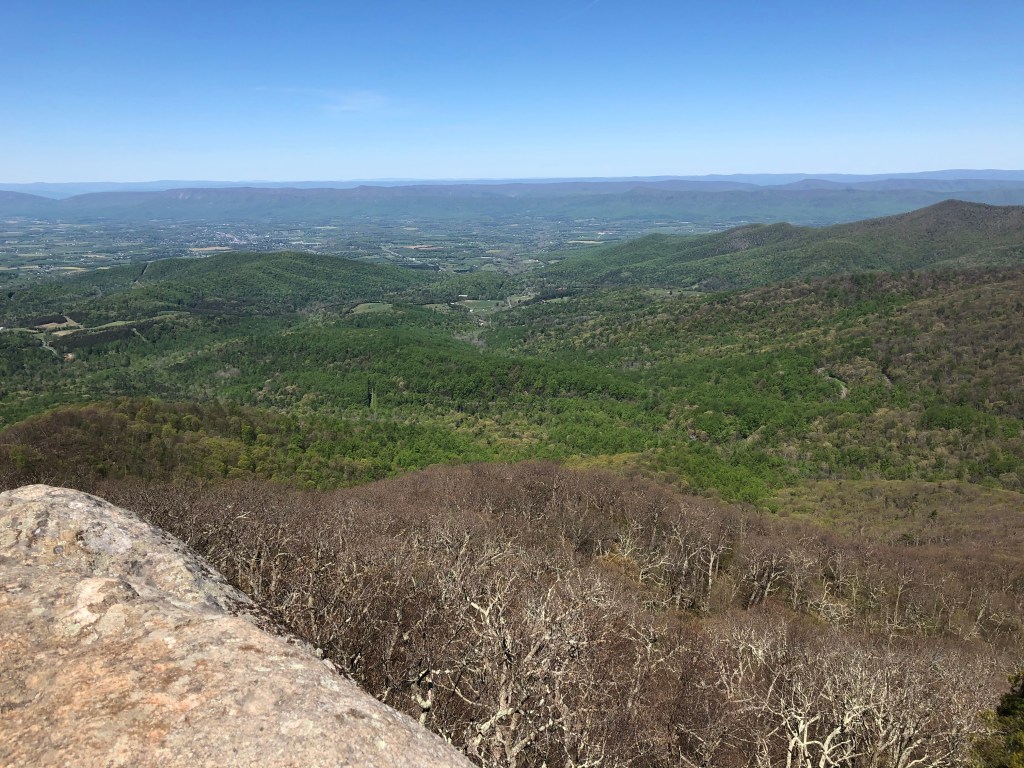 First stop, Marys Rock. Not even noon yet, but already a bunch of visitors shared the spot with us, with more coming. A light wind surprised us with its chill. We stopped to eat and enjoy the commanding view of the Shenandoah Valley to the west and more of the Blue Ridge Mountains to the north. On this clear day, visibility was outstanding.