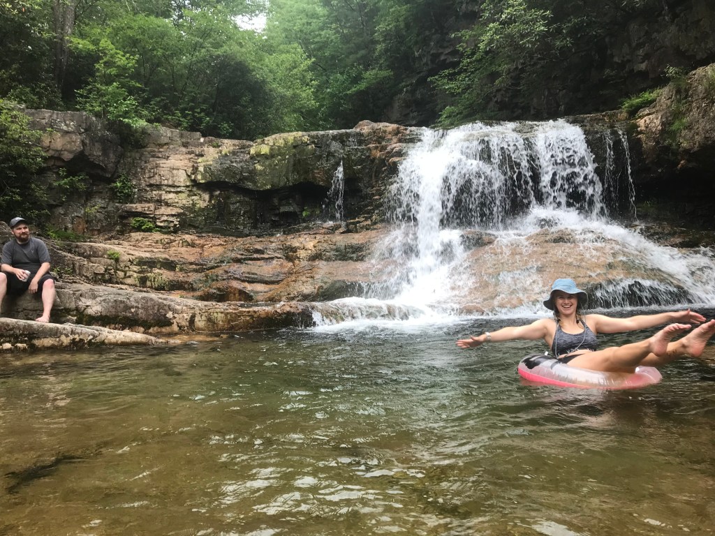 We decided to set up our tents to lighten the load before our out-and-back to the falls. We passed several lovely stealth sites and a few good swimming holes before reaching our destination, where settled in quite readily. Madelyn pulled out her inflatable tube and offered the beers we’d packed, then we took turns exploring the upper falls and chatting on the rocks. The water might have been more enticing on a hotter day, but that didn’t stop Madelyn from floating around in style!