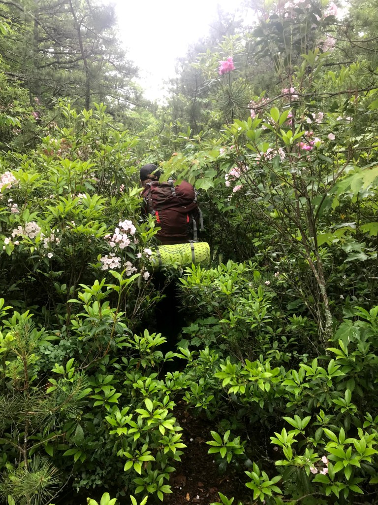 We took a quick break at the largest fire ring I’ve ever seen, where Lisa and Ashraf caught us up on the power of the wild horse lobby. Then we hopped off the forest road and onto Slacks Trail. Despite the knee-pain-inducing, seemingly-never-ending miles of downhill, I think this was my favorite section. You could sneak views of the forest above the thinned out vegetation along the entire ridge walk, and did I mention that the laurel and rhododendron were in bloom?