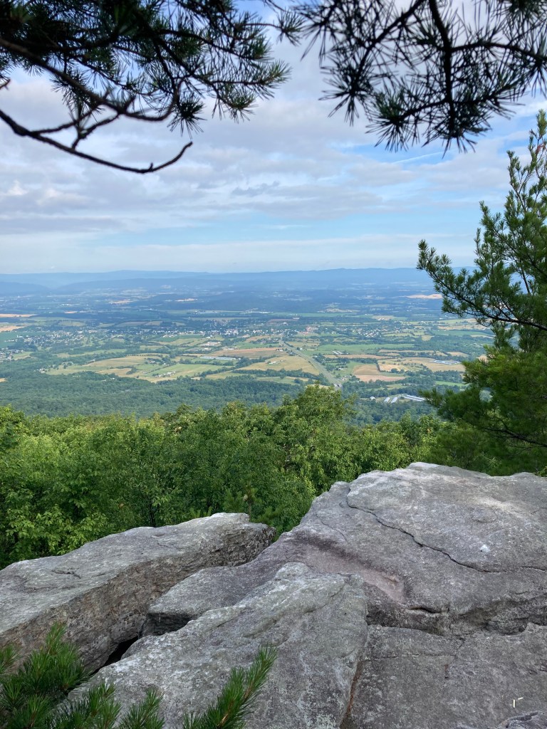 The trail began with a hot, steep climb—1,800 feet by my GAIA app. (Karan thinks my app underreports elevation gain, so I’ll accept “bonus elevation feet” anytime). We reached the ridge sweaty, but found the mountaintop breeze and the Shenandoah Valley view refreshing. We followed the ridge line to Emerald Pond.