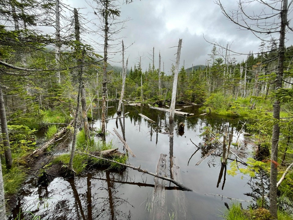 The wooden planks in boggy spots are a familiar sight to anyone who’s hiked in the Adirondacks. Being covered in water—also familiar. Less so are the planks disjointedly floating in the water, a sight that greeted us as we neared Feldspar. Michael and I paused to figure out how to even start crossing what now looked like a lake. Michael ventured out on one of boards and tried to assess the situation while floating about the water. We tried one way and then another to cross on the boards, but they were too unstable and the water too deep.