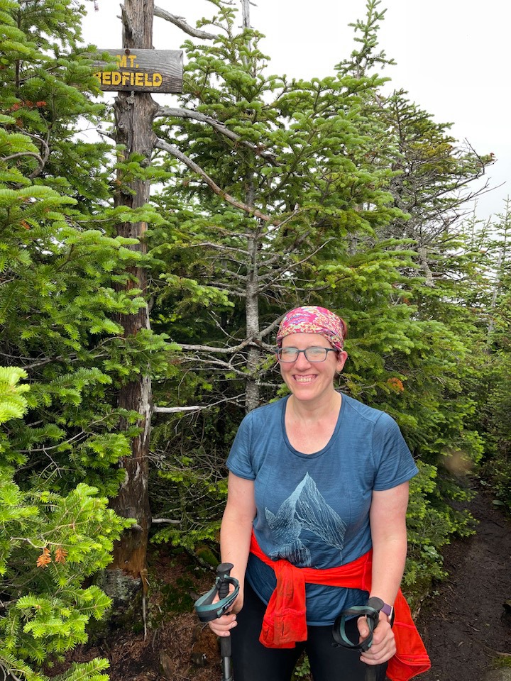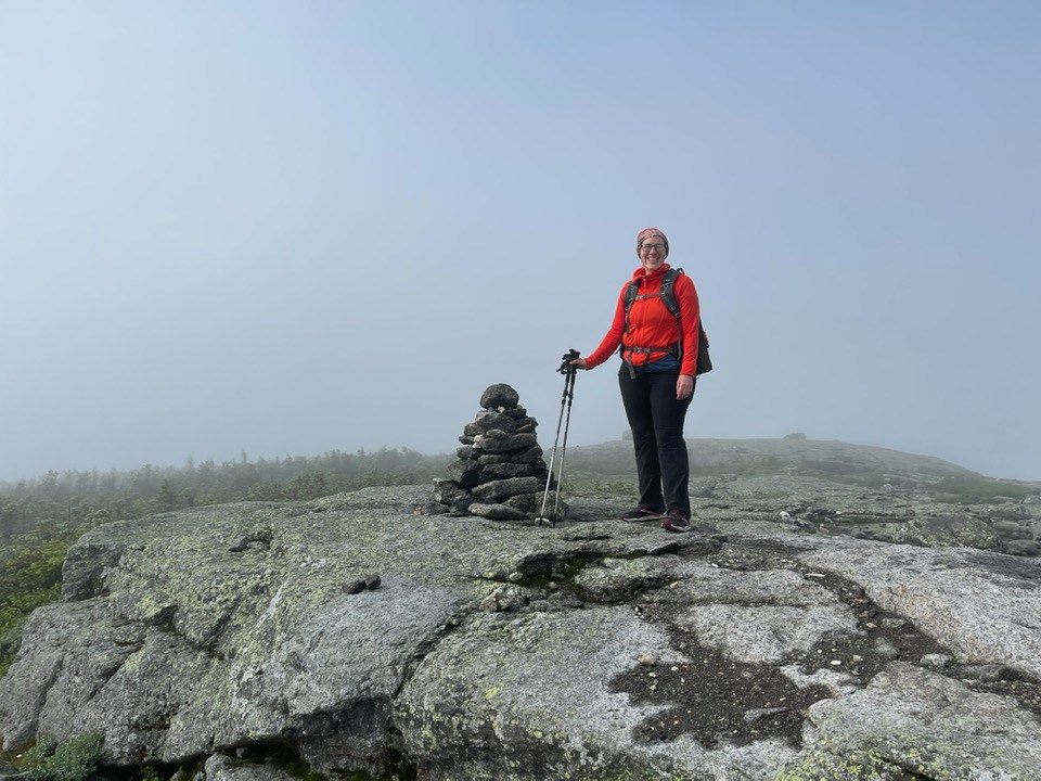 Sunday morning and it was game time. We headed to Skylight and Gray first. Lake Tear of the Clouds was covered in mist as we arrived and began the steady climb up to Skylight. No views for us but it was still a beautiful sight. Then over to Gray—a few of the scrambles had us (okay me) poking around for easy ways to climb up and down, but we made it there. As we descended, the sky briefly opened up and we could start to see the surrounding mountains.