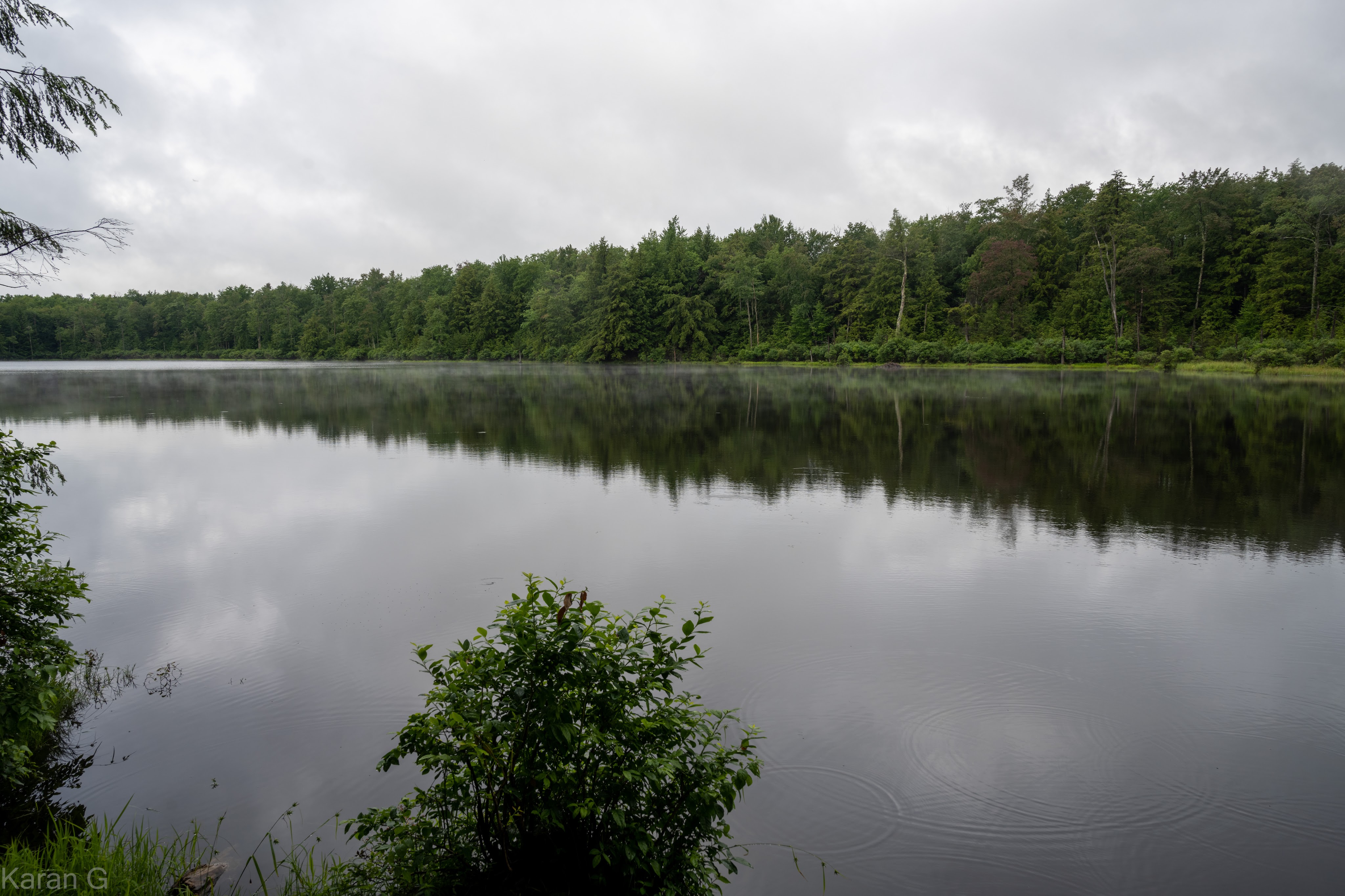 It rained overnight and into the morning when we hit the trail, resulting in raging water along the Haystacks. It would rain on and off during the entire day, despite the sun making appearances in between. The climb to the plateau led us to the pretty Sones Pond. The next few miles were a blur as we made our way through the super wet conditions. We stopped for a break at High Rock, enjoying the view of the World’s End State Park. The park people had trapped a bear near a dumpster and were putting it on display to people. The bear was going to be released in a couple of days.