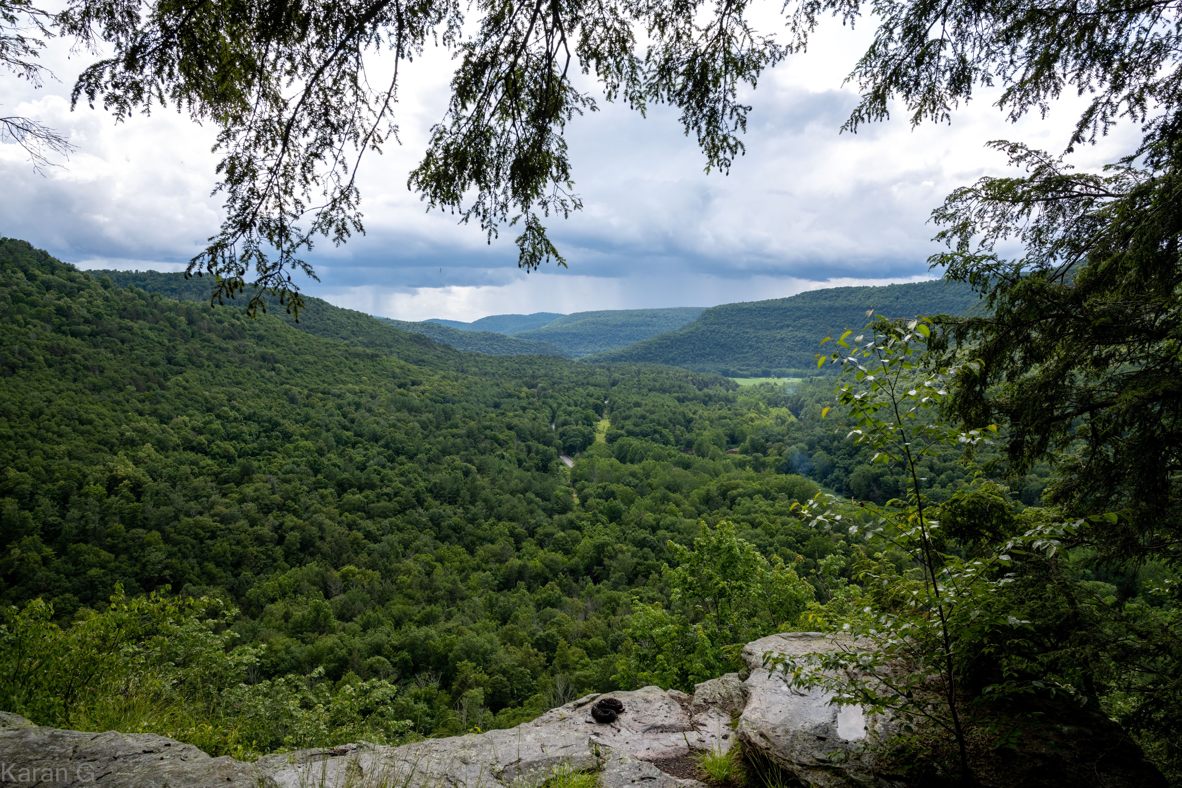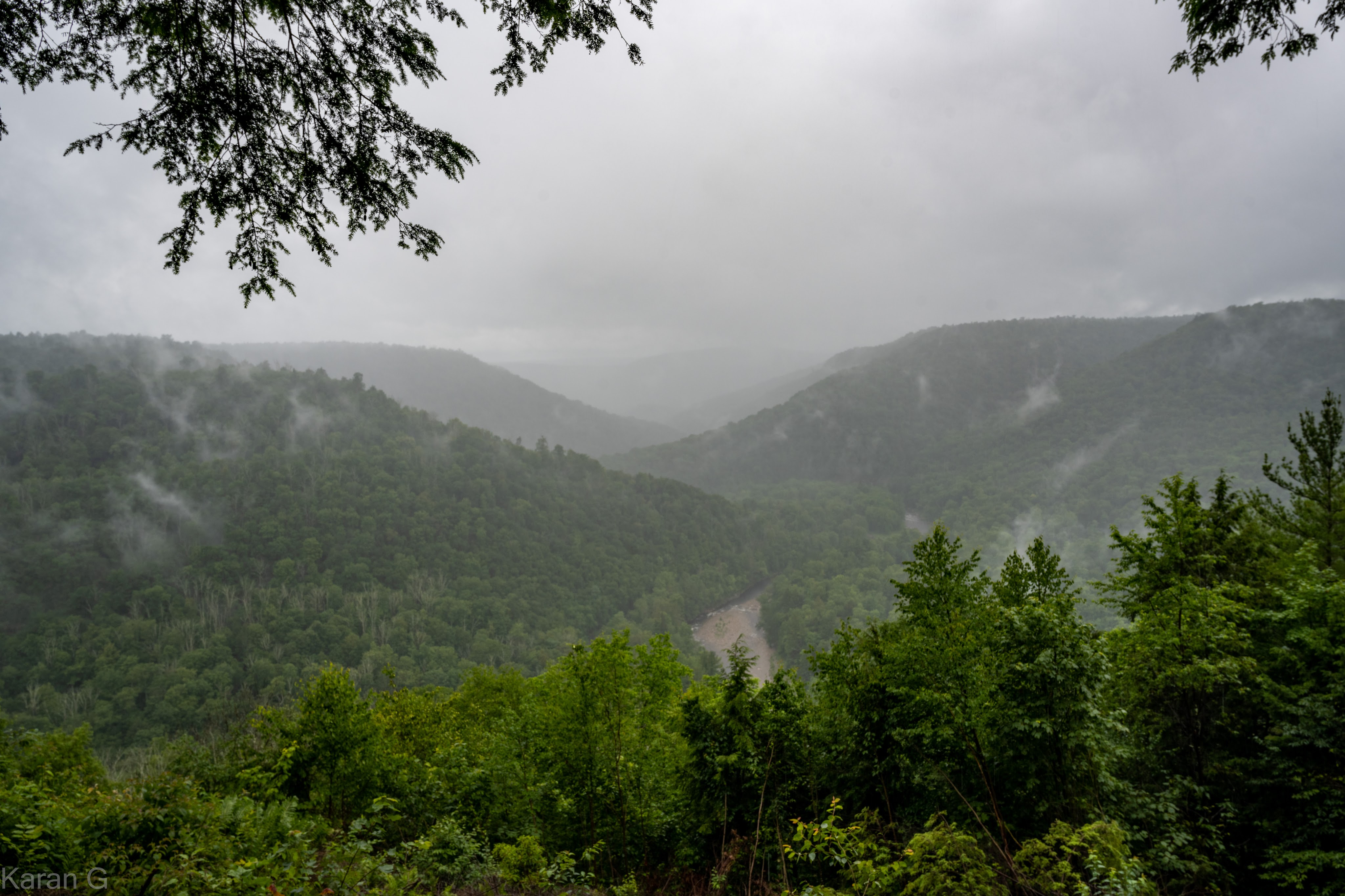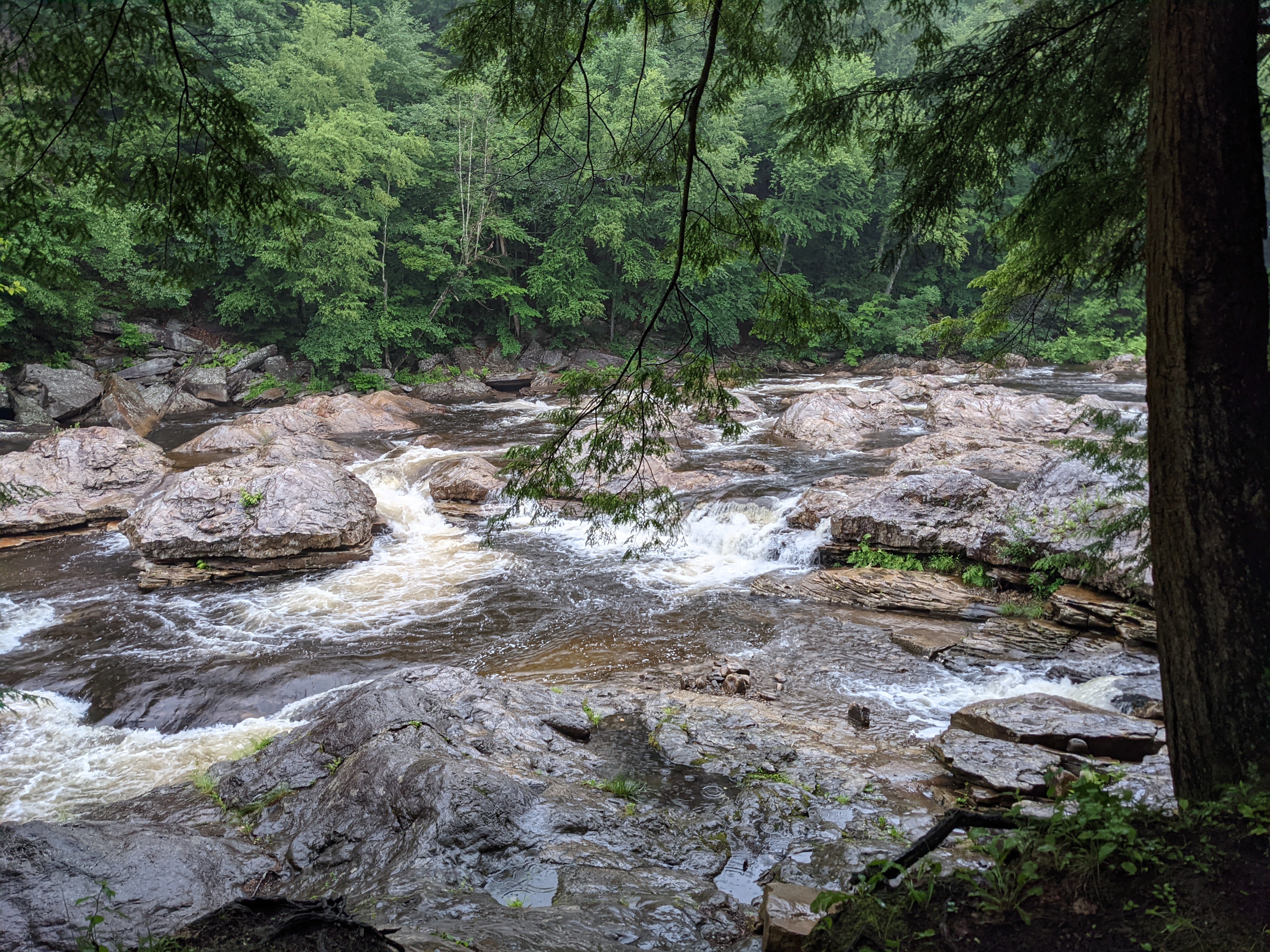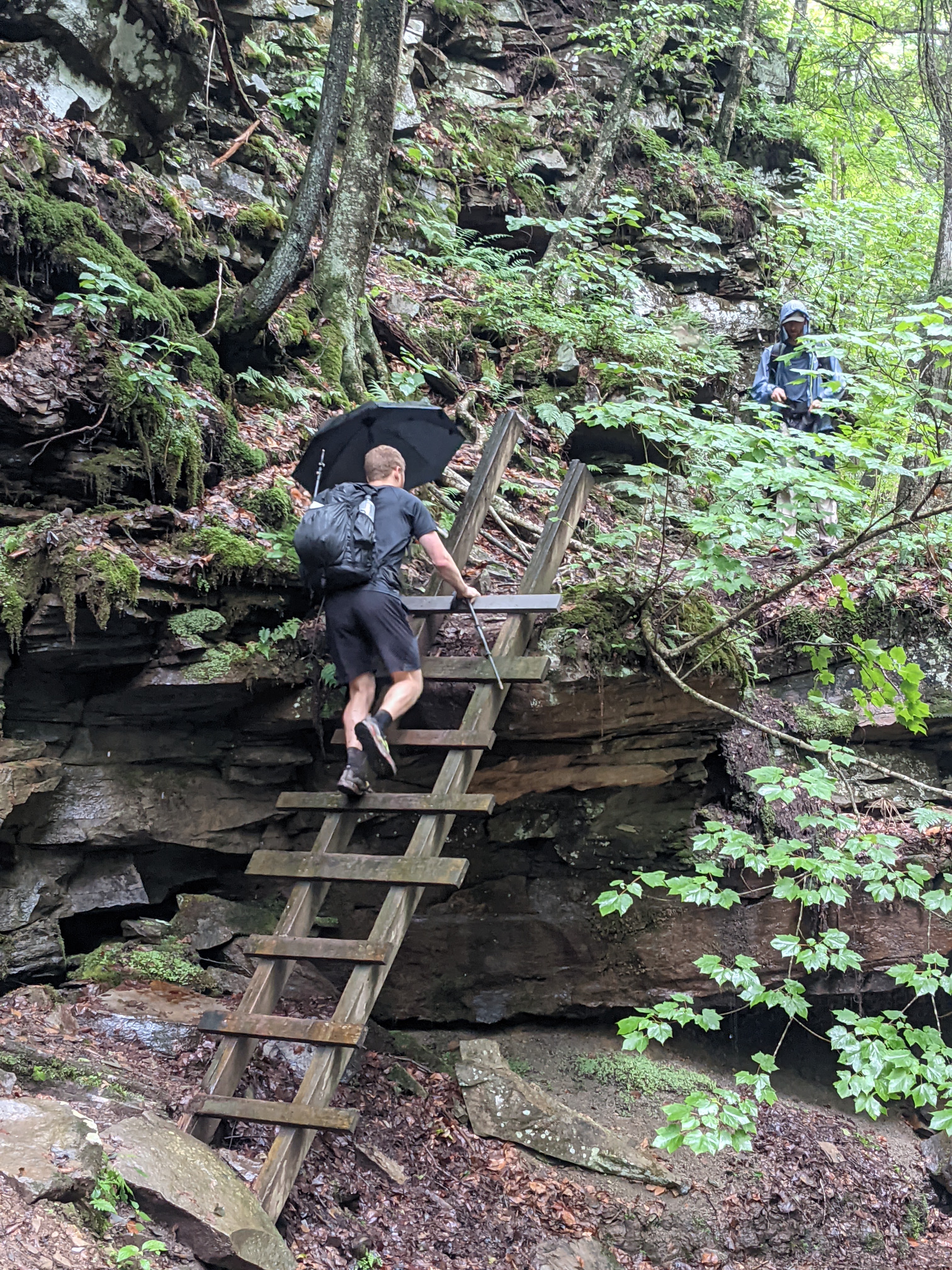 We made the climb out of the park in wet, humid conditions. It was pouring when we got to Loyalsock Canyon Vista, but there was still a view through the rain. We soldiered on and stopped at Double Run for a lunch break. It felt weird being a bit chilly during breaks in July. Welp, the climb out of the valley warmed us up and the mile-meter kept going up. At the Alpine View Vista, we took an extended break and tried drying our wet gear. While the ladder signs were intimidating, the actual ladder next to Rode Falls was really not. The Falls had a humongous amount of water in it from the fresh rain. Some folks had already taken the large campsite next to Ketchum Run, so we took the next smaller site that fit us. The rain had stopped at this point. Fire making was a challenge due to the wet conditions, but everyone worked hard to keep it going and it paid off. Tired from the long day, we hit the sack before it got fully dark.
