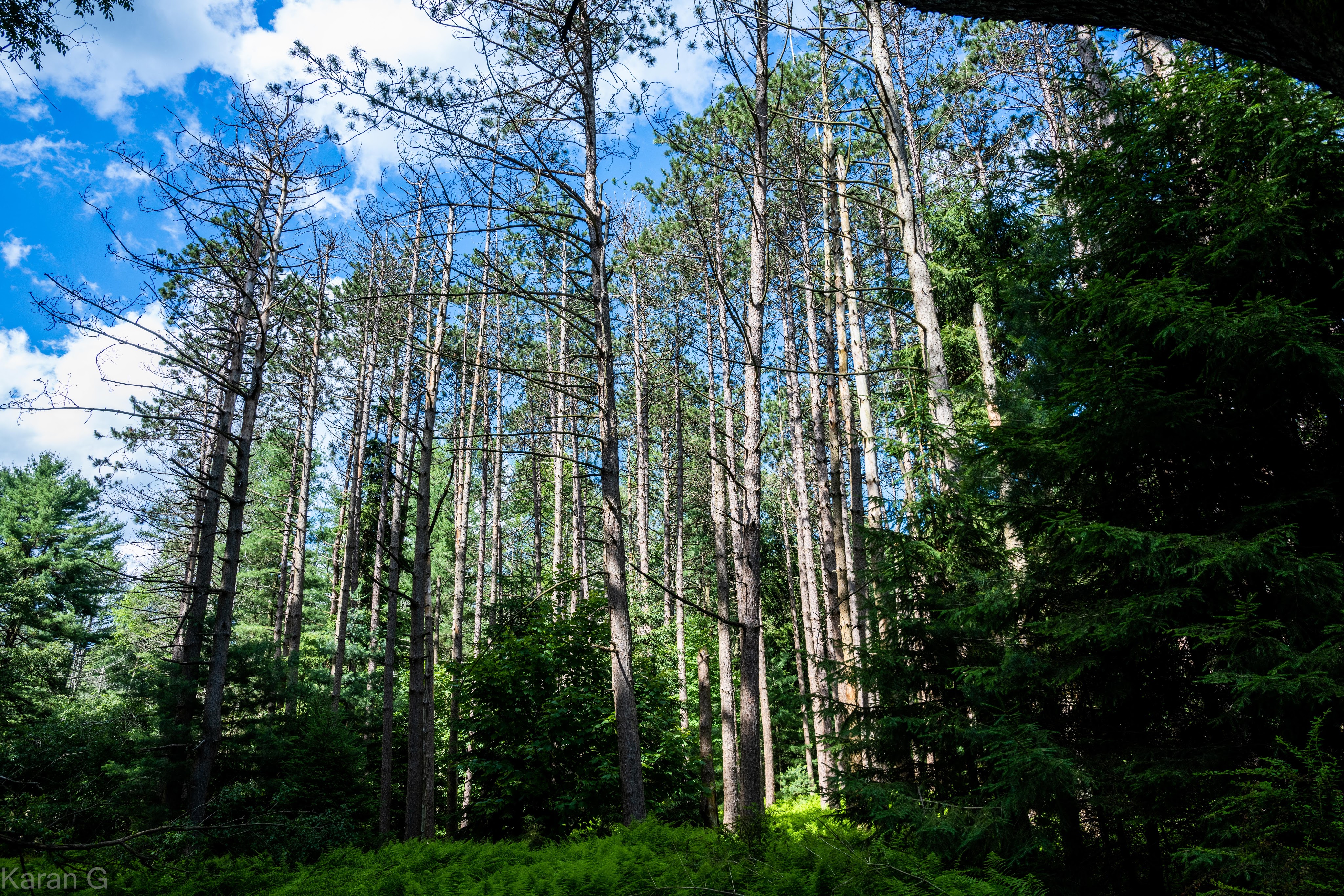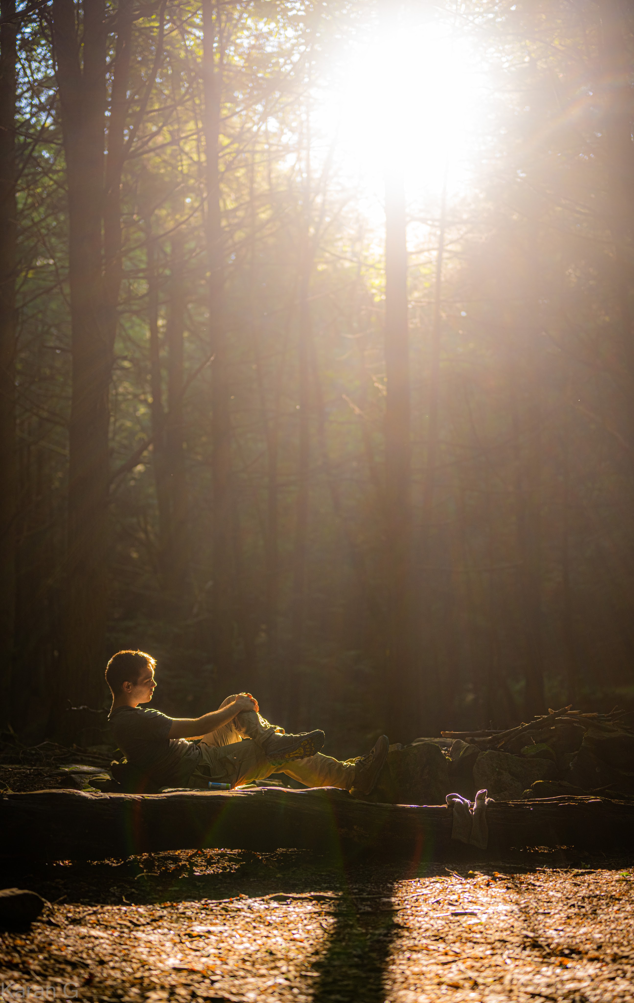 An open, wide landscape treated us at the top of the hill. At the members only Highland Lake Manor restaurant, we tried our luck on scoring food. At first, we were point-blank denied. As we hung our faces and started walking out, we were called back in. A kind lady had decided to sign us in as guests. We relished burgers, waffle fries and sodas in the outdoor seating area on the beautiful day. We resumed hiking and finished off the road miles in good form. After a climb, the trail took us through tall pine trees. We crushed the final miles to camp at a fast pace and arrived at our beautiful site next to Shingle Run. The feeling of camping near soft pine needles was soothing, and the light was just beautiful outside. Getting the fire going was again a bit of a challenge, but easier than the day before. A few of us didn’t cook, still full from the earlier meal.