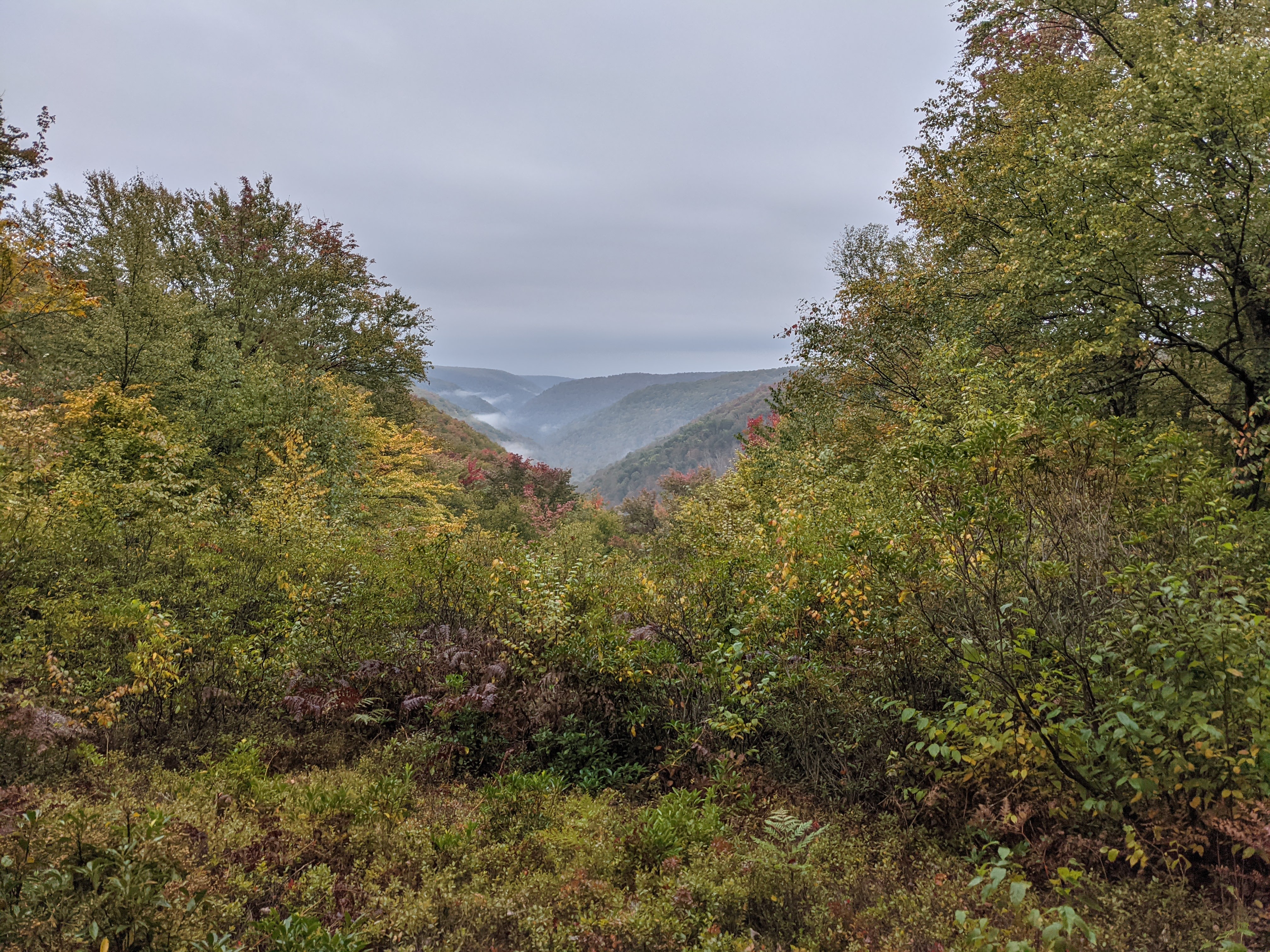 After a little more climbing, we got our first daylight views of the surrounding ridges and sea of clouds. The fall colors were even starting to appear. We descended to Naval Run and then climbed again. At the top of the next climb, we passed by a rattlesnake right next to the trail. Dimitri later confirmed that it was dead which explained its lack of reaction to half a dozen hikers passing nearby. Meanwhile, David was hurrying to get his “10 by 10,” although since he was using his underestimating GPS as a guide, it may have been more like 11 or 12 by 10.