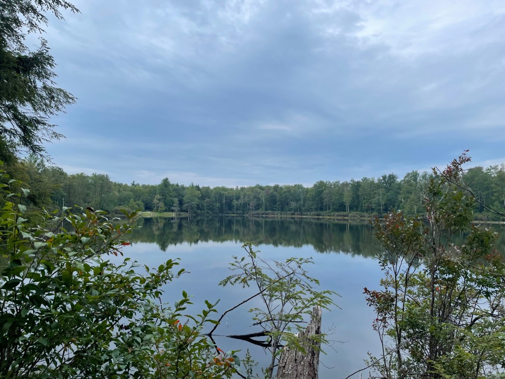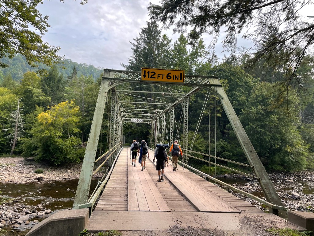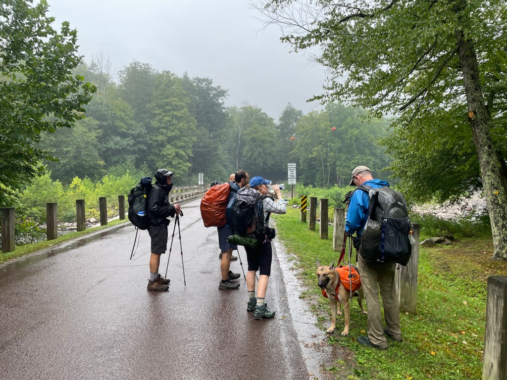 On September 3-4, 2022 eight DCUL backpackers did an overnight counter-clockwise loop over western Pennsylvania’s Loyalsock Link and Loyalsock trails. We had planned a 16.2-mile route from World’s End State Park, but ended up doing a little “bonus” mileage and elevation when the blazing and signage on the trails proved confusing. The weather was cloudy and humid for most of the trip, and it rained heavily at the end, but that kept the temperatures moderate and we got some nice views of the Loyalsock Creek Valley from High Rock, Canyon Vista and elsewhere. The smaller creeks were either dry or running at a trickle in the late-summer drought, and even the normally-substantial Loyalsock Creek was down to perhaps a tenth of its flow. The lack of water to drink caused us to adjust our route, but it had the advantage of drying out normally swampy areas so we could move at a fast pace. It was a fun weekend in the woods, with several climbs and descents to get our lungs pumping, some interesting rock formations, a secluded campsite by the creek, long stretches of gentle forest walking and good conversation.
