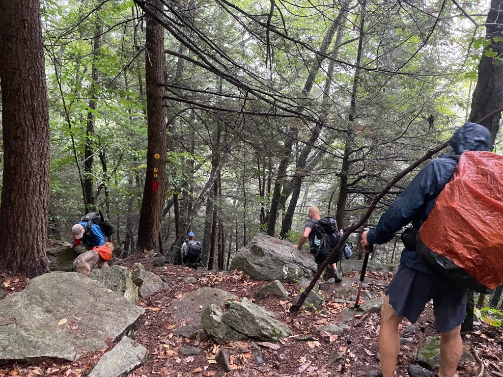 Then things got a little challenging. Clouds and rain sprinkles closed in around us as we worked hard to ascend to High Rock Vista, but the real rain opened up just as we started the grueling descent down the rock slide area. Thankfully, none of us slipped on the slick and jagged rocks, but we moved very carefully indeed. I’ve heard that section called: “a mile of the White Mountains teleported to Pennsylvania.”