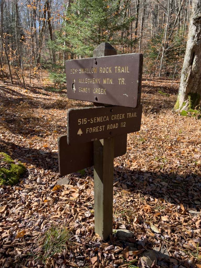 After the larger group departed, Vince, John, Bess and I continued down the Seneca Creek Trail to Upper Seneca Falls, which was flowing relatively lower than normal but was still very picturesque. I was a bit annoyed to see a sign with a QR code had been installed near the falls by WV Tourism, encouraging hikers to post their pictures to social media. Maybe I’m just a cranky old-timer but I prefer as little manmade infrastructure in the backcountry as possible.
