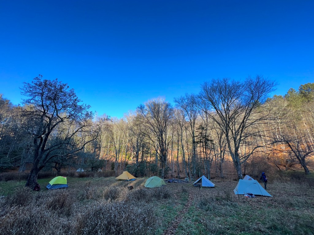By the time we reached the Tom Lick Trail, I was concerned that my watch was already reading 7.5 miles since the day was only supposed to be 11 miles and we still had quite a distance to go until reaching our intended camp at Upper Seneca Falls. As we crested the Allegheny Mountain Trail, I realized what I’d done wrong; though I had drawn a 17-mile loop in CalTopo at home, I had my 23-mile summer route loaded in Gaia GPS on my phone and had been navigating off of that. We should have turned up the Swallow Rock Trail according to my 17-mile route. Rather than mutiny, everyone took the news well, which I was grateful for. We decided to camp back at Judy Springs for the night since the shadows were growing long, bodies were aching and several of the applicants had set personal records for miles walked in a day, 12! It wouldn’t be a DC UL trip without some bonus miles 🙂