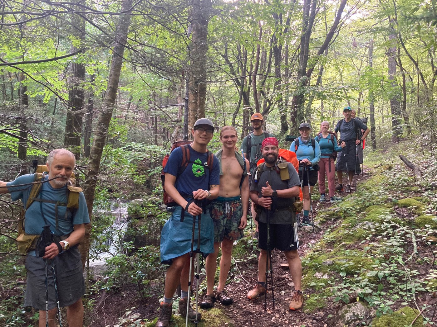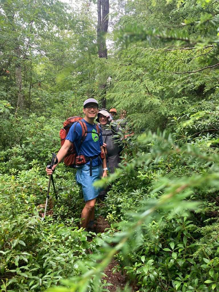 We slept late—with the wake-up call at 7:00 a.m. For the first time we could all see each other. The previous late night climb felt like a foggy dream—did it really happen? After re-introductions we continued our climb up Cellar Mountain. This part of the trail was hopelessly overgrown. We had to push our way through the bushes to propel forward. Dmitri (“Bike Santa”) loves bushwhacking, so he had plenty of bushes to wack. The rest of us just pushed forward stoically. After a time, we broke through to a poorly maintained fire road. Our route swapped the challenge of fighting the overgrown bushes with the different challenge of passing road-width-wide muddy puddles—some up to waist deep, which Shane (“Dad Joke”) and Jonathan (“Shenanigans”) discovered the hard way. Being out of the bushes and forest also meant no protection from the hot sun amplified by the humid air. Some took out TRDDs (umbrellas) for shade. Henry (“GQ”) ripped off his shirt and let down his shoulder length blond hair to catch a breeze. Someone immediately offered him the trail name, “GQ,” to fit his male-model persona.