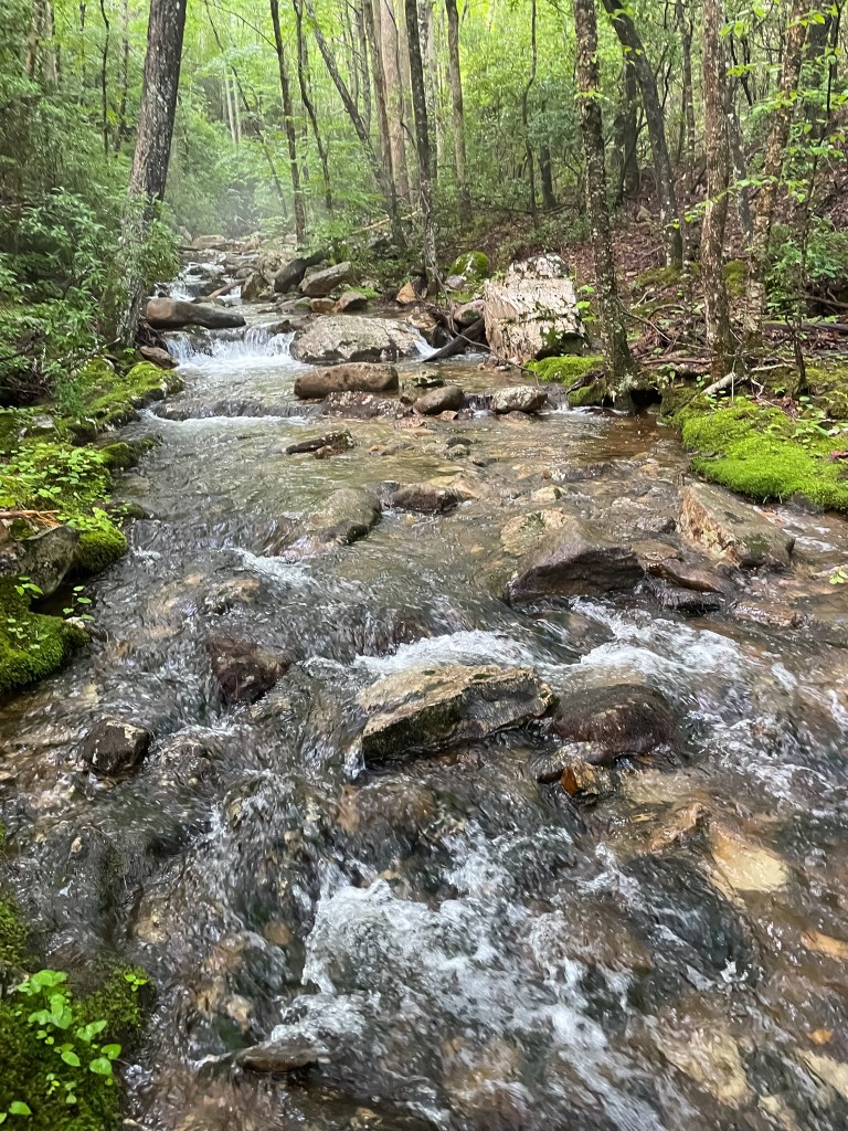 My plan was to circumnavigate St. Mary’s Wilderness in central Virginia between Staunton and Waynesboro—not far from the Shenandoah National Park, but in the George Washington National Forest. The Wilderness is best known for its falls—a popular swimming hole for locals and visitors. It sits in a deep valley created by the St. Mary’s River, a cool, crystal-clear stream running fast over smooth, blond rocks. Originally, I intended to hike the loop counterclockwise. My goal was for us to spend the afternoon at the falls after a morning hike to it. Summertime backpacking trips in Virginia are tough. It can get hot and humid! So, an extended water feature seemed like a good highlight for a low mileage trip.