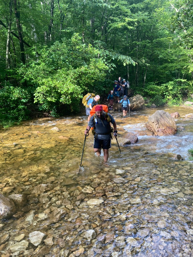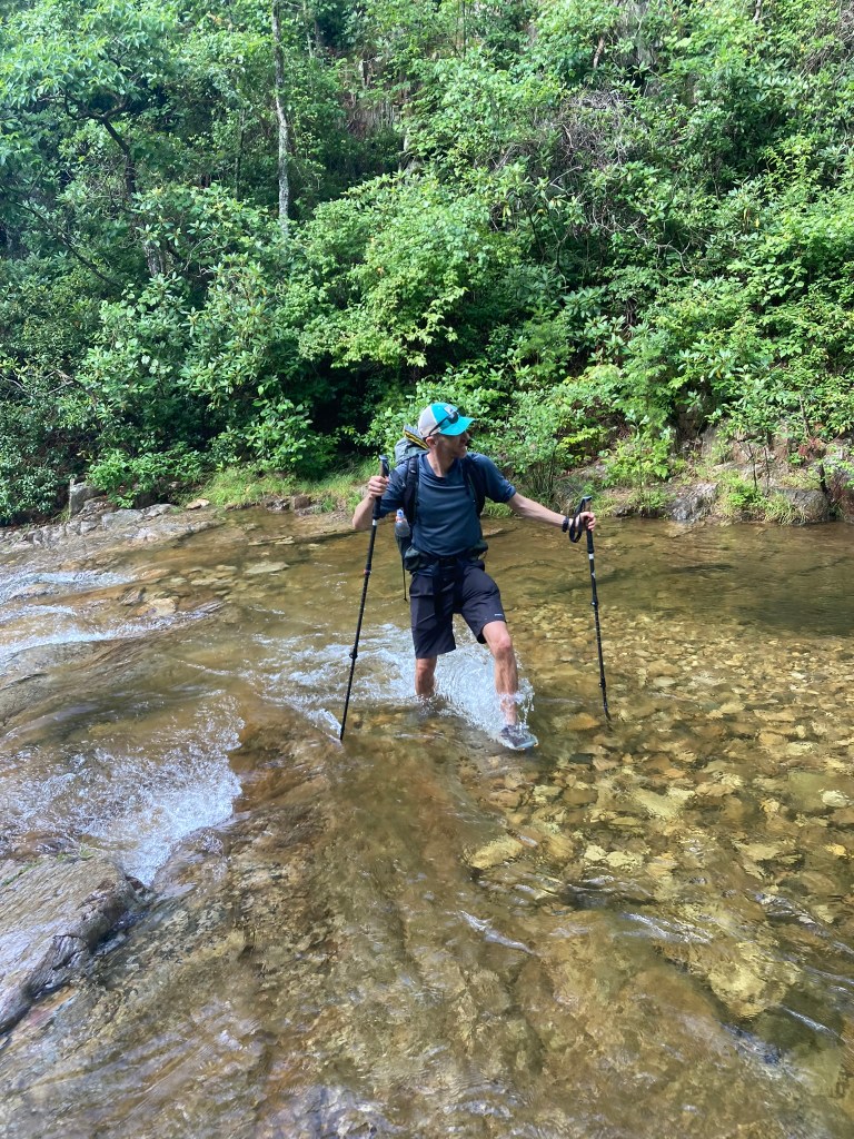 The next morning, at the wake-up call time of 7:00 a.m., the rain continued. All Electric nervously approached my tent to ask for the “plan” considering the heavy precipitation. His tone did not sound enthusiastic when he internalized that we’d get wet. Happily, he did not have to do so. As we broke camp the rain stopped, and the day became picture-perfect. The trail, alongside the whitewater stream with multiple cascades was beautiful—one of the most picturesque in Virginia.