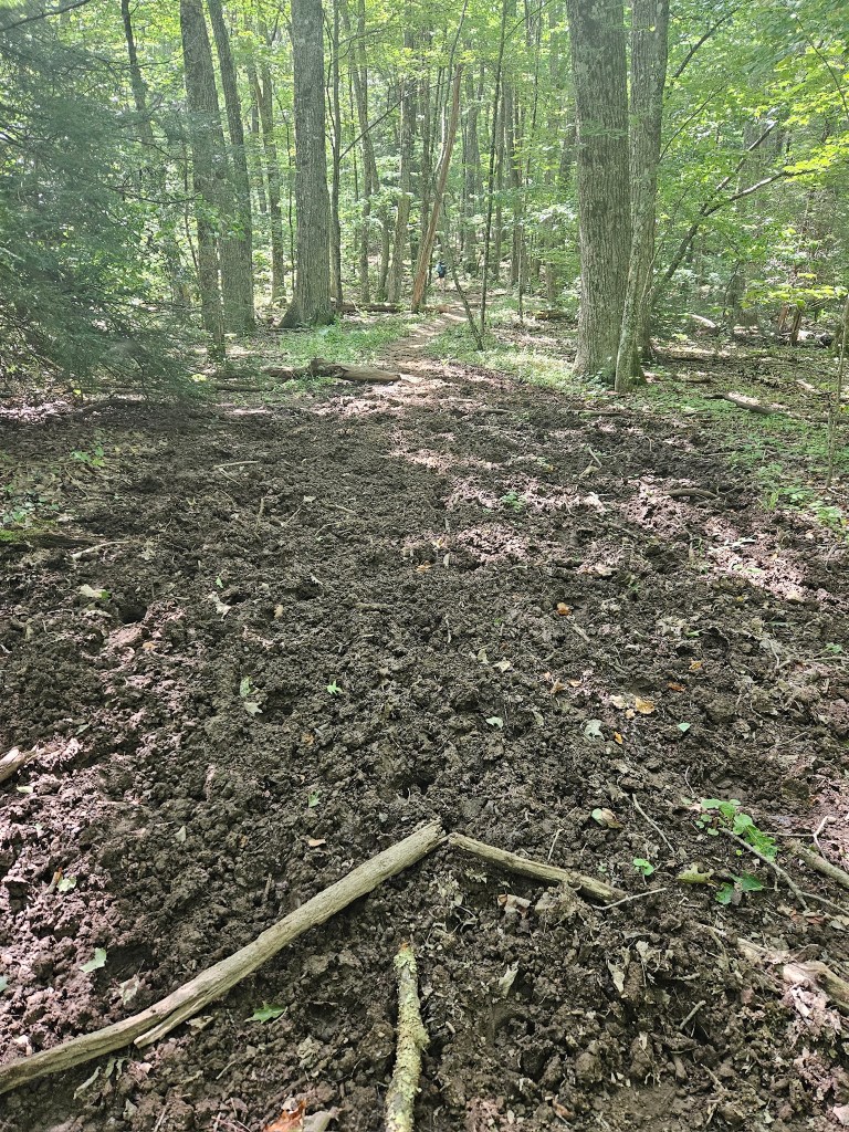 As with Saturday, our fast hiking pace and extended prior day hike resulted in us arriving at our evening destination too early. Our transition from the AT to the IMT was a bit jarring. First, we engaged in a short bushwhack from one trail to the other along an abandoned linking trail. Going from the well-trodden AT to an abandoned trail shocks the senses with the need to navigate overgrown underbrush and deadfalls. Second, the IMT is heavily used by horseback riders. The horses badly tore up the trail, leaving heavy, loose top soil and thick mud that was strenuous to tread. It was also very steep. However, we were not on the IMT for long before arriving at our intended shelter.