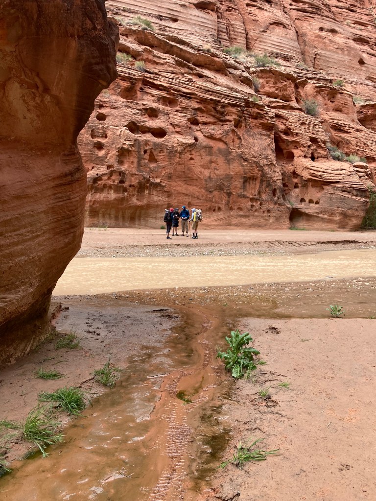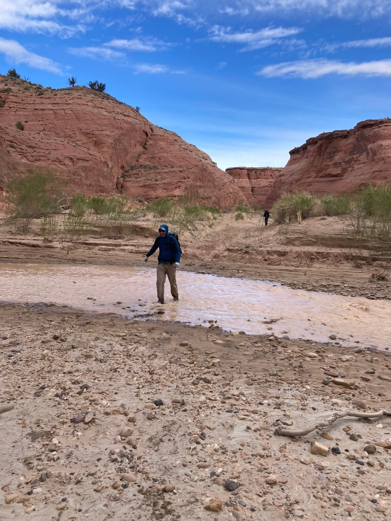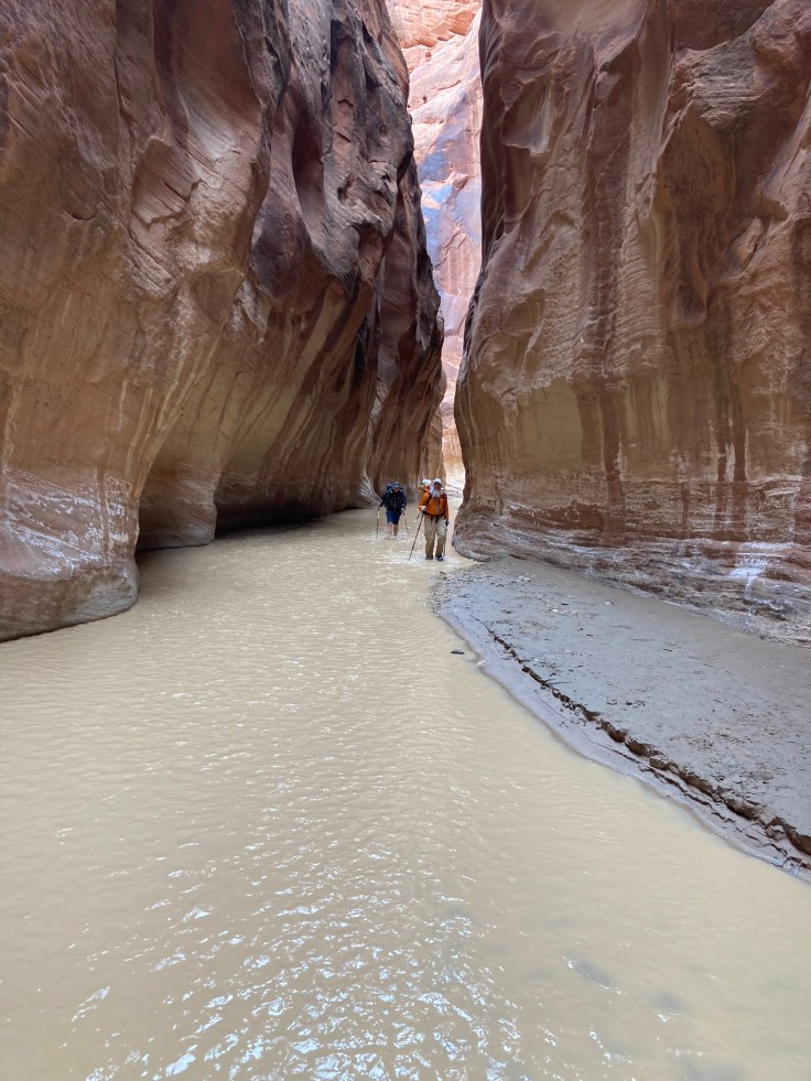 The Paria River is excessively silty, looking much like coffee with a lot of cream in it. One could not see the bottom to assess the depth. We quickly learned it was only ankle deep almost the entire way with a soft sand bottom. The water felt cold, but not freezing. We wet-crossed the meandering Paria four more times when I realized it: the Ranger was punking us with his “no wet feet” prediction. No one does this trek in the spring with dry feet! Well played, Mr. Ranger. You got us.