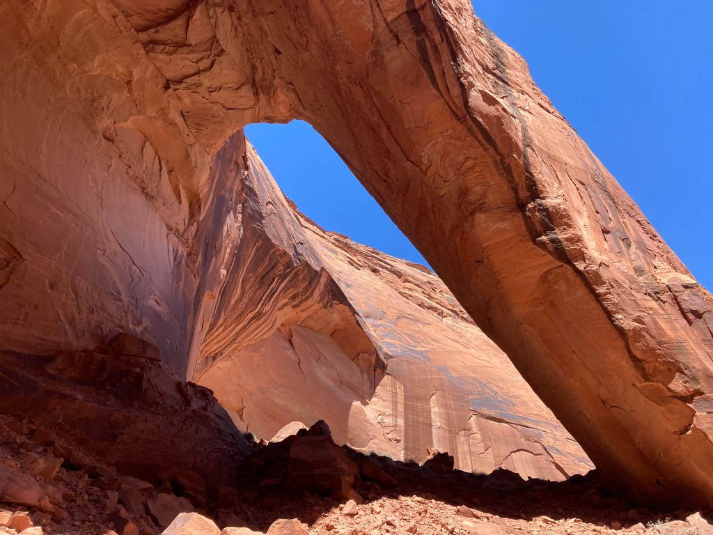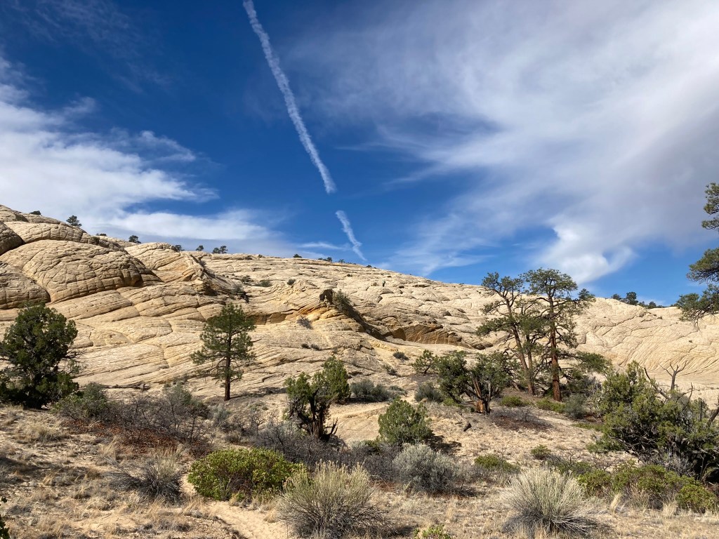 The next day, we took the Mail Trail back to our cars in Escalante. The Mail Trail runs between the towns of Escalante and Boulder. As the name suggests, postmen blazed the trail to deliver mail between them. Later, a telegraph wire saved people from this challenging trek. The telegraph wire remains to this day, albeit unused. This part of the trail featured our only significant elevation gain of the trip. After so many days of hiking on flat canyon bottoms, it was great to have the challenge. As my calves screamed on yet another slope of slick rock on our route up towards the sky, my heart raced from the physical effort. The enfolding views built and built. Too soon, we returned to our cars, ready for the next part of our trip.