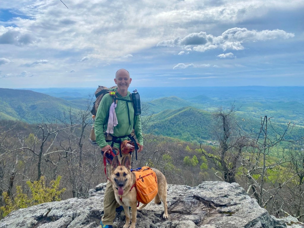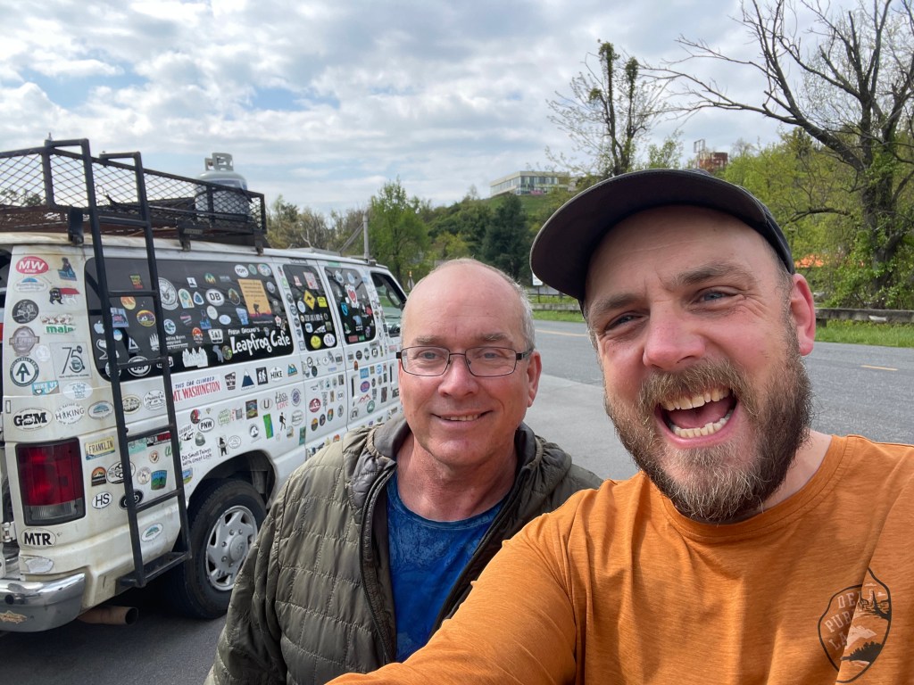 The final day featured a quick and easy 7.7 miles from Calf Mountain to Rockfish Gap, where the Skyline Drive meets the Blue Ridge Parkway. At the parking lot, we were greeted by perhaps the most famous AT “trail angel” of them all — the inimitable Fresh Grounds. Traveling from AT road crossing to crossing in the Leapfrog Cafe camper van, Fresh Grounds has been handing out fresh fruit and other “trail magic” to hikers for years. He even had healthy treats for the dogs. What a nice taste of the AT community spirit! Check him out here: https://www.instagram.com/freshgroundleapfrogcafe/related_profiles/?hl=en