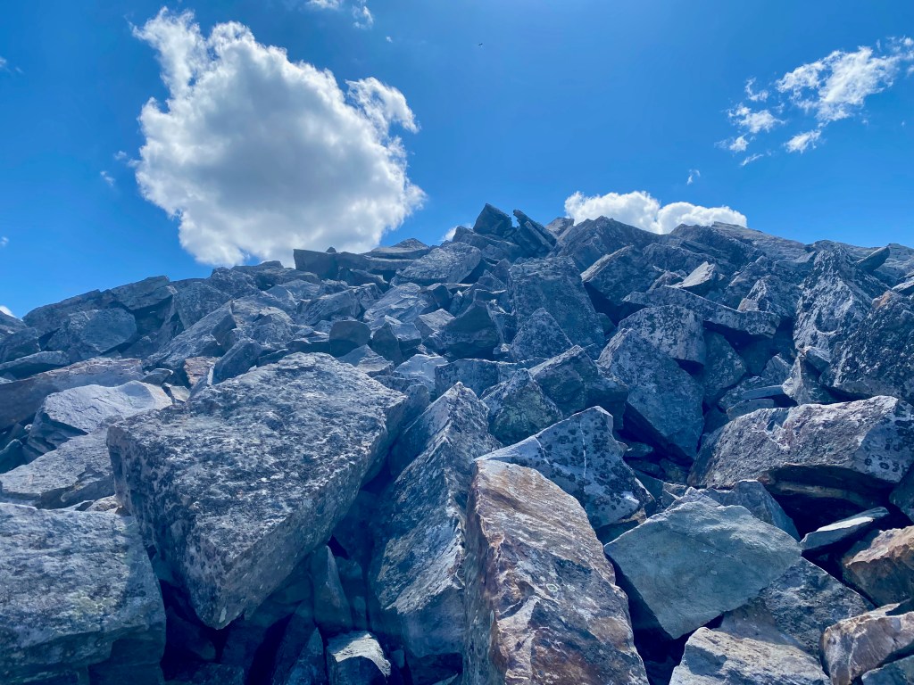 Day 4 was the second-longest, at 13.4 miles to get to Calf Mountain, but it seemed easier, since our packs were getting lighter as we ate our food and we got into a rhythm. It featured the spectacular rockslide area at Blackrock. Some of us stayed to admire Blackrock at length, while others moved through relatively quickly, since the rocks got hot in the mid-day sun. As usual in Appalachia, we moved all day up to high ridges and meadows and down to narrow hollows and wide pastures.