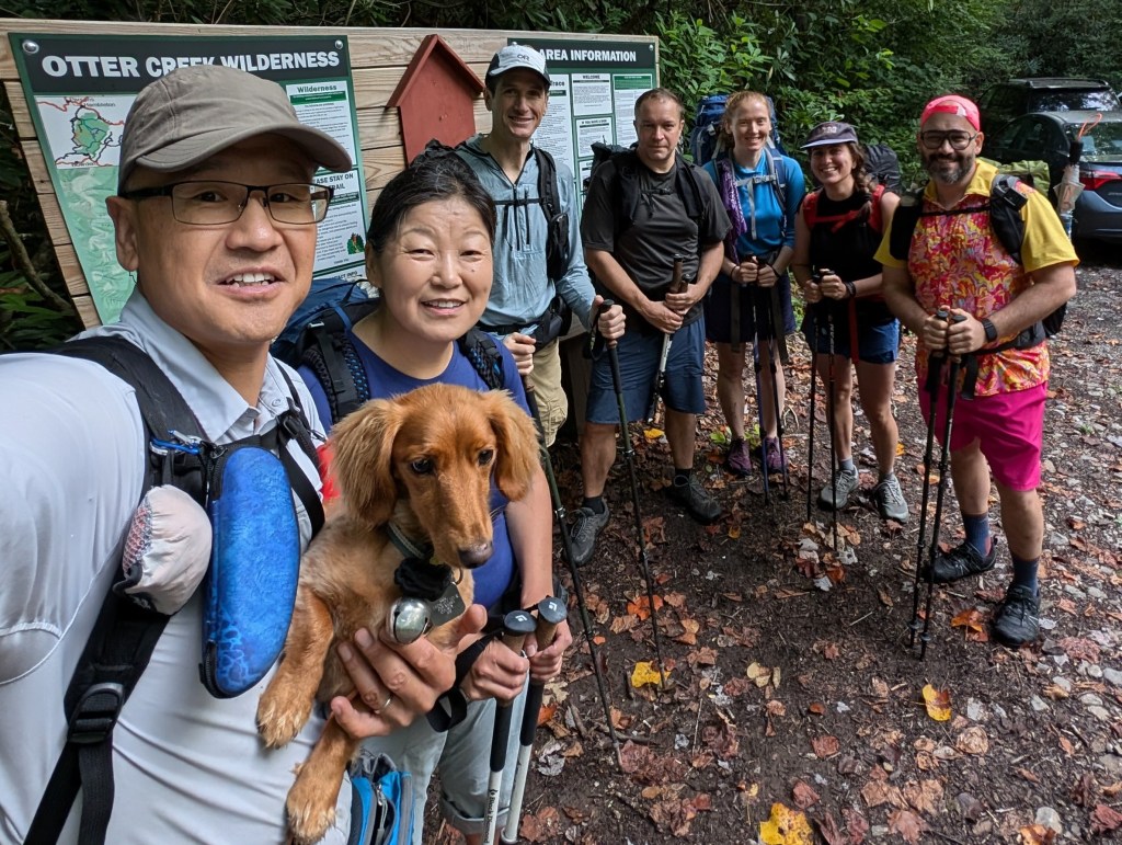 The eight of us on this trip had no trouble waking Saturday morning at 6:30 to begin our hike into Otter Creek. Our plan that day was to hike 21 miles through the western to northeastern part of the Wilderness, camping along Otter Creek that night. Haigang (“Two Gangs”) misread the trip posting. I wrote that I hoped to see an otter; he took that to mean he needed to bring an otter. So, he brought with him his tiny long-haired dachshund, Mocha (“Sam”), who looked like an otter. I was skeptical as to whether that tiny dog could manage a rough trail, but that dog could jump over knee-high deadfalls like they weren’t there.