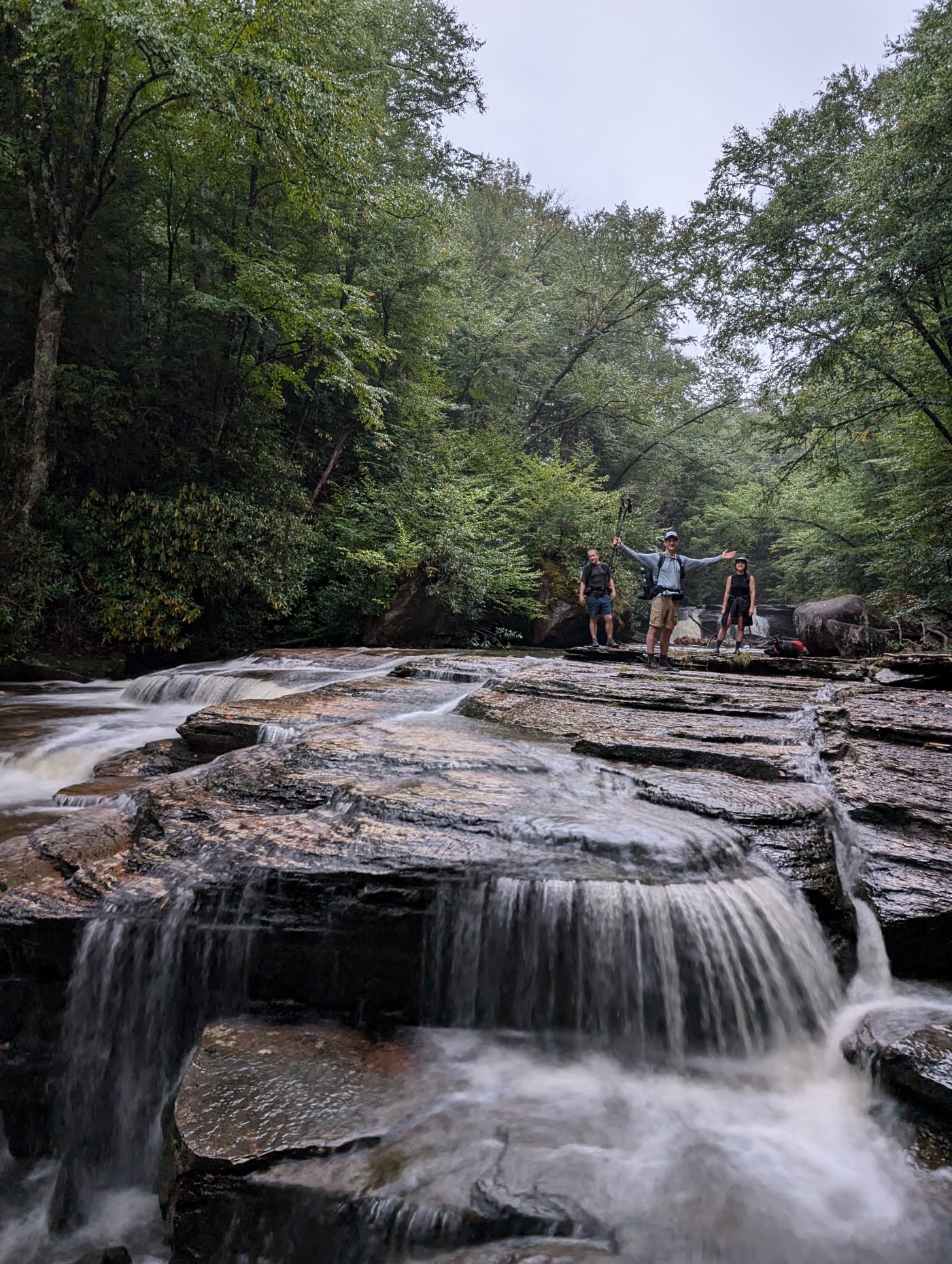 Sunday was a nice twilight stroll along Otter Creek, its waterfalls swollen to glory from the overnight rain. WB, Man With No Trail Name, and I walked down onto a section of shale slick-rock in the middle of the creek with rushing water all around us and a huge waterfall upstream. Two Gangs carried Sam down for photos.