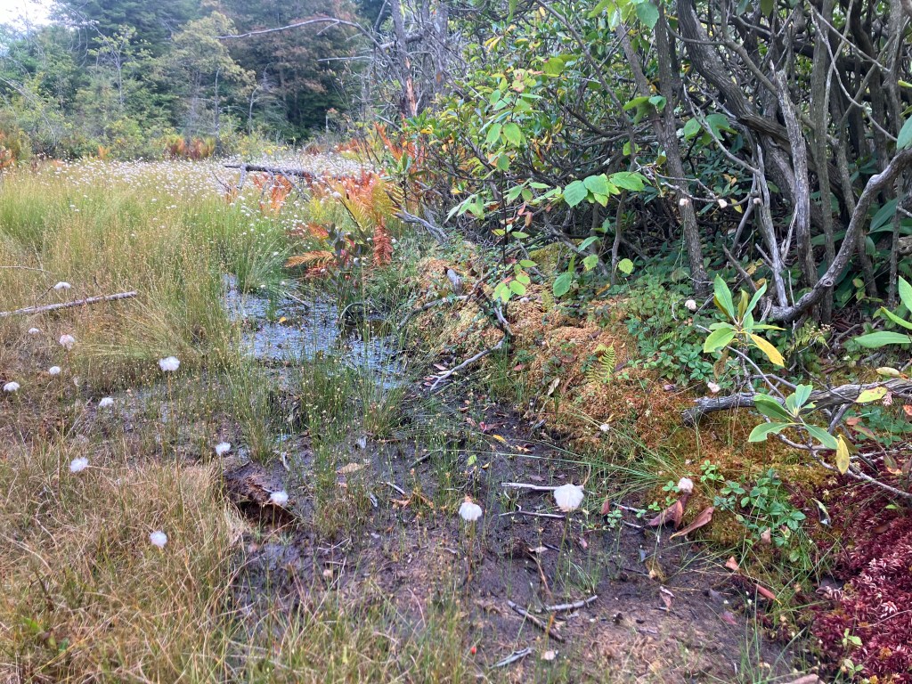 Our break from the rhododendrons was a bog. Until now I never knew the difference between a bog and a swamp. I now know that a bog is a shallow pond that fills with dead vegetation until it gets covered in spongy moss.