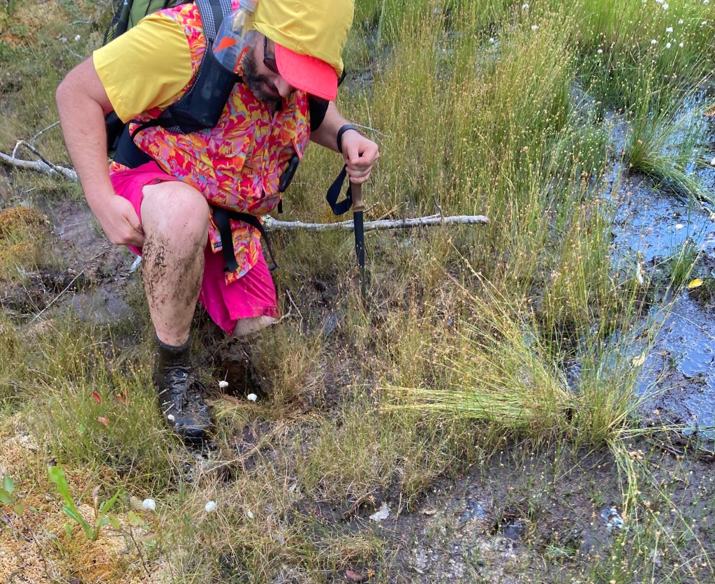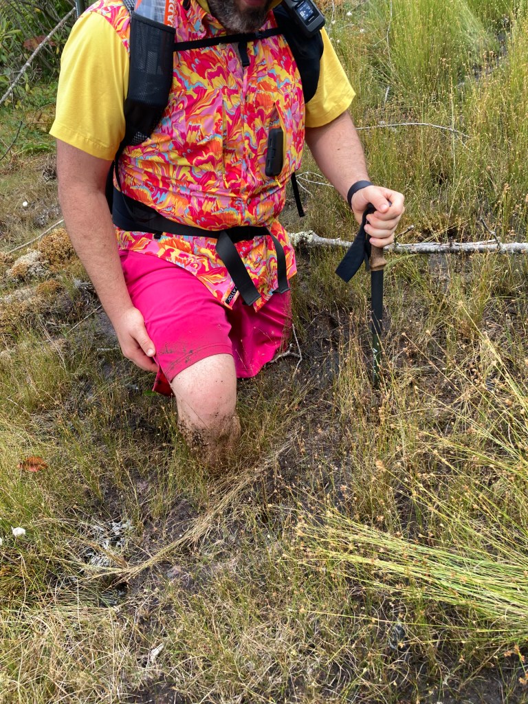 Walking on this bog mostly felt like walking on a memory foam mattress. Girl With the Big Pack had hiked this trail the prior month and warned us to test the ground before weighting each step to avoid getting stuck in the mud. Otter did not heed this advice and at one point sunk in to the mud up to his waist. Everyone else was glad he happened to be in the lead at that point. I helped pull him out of the muck holding him down.
