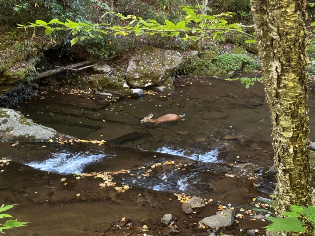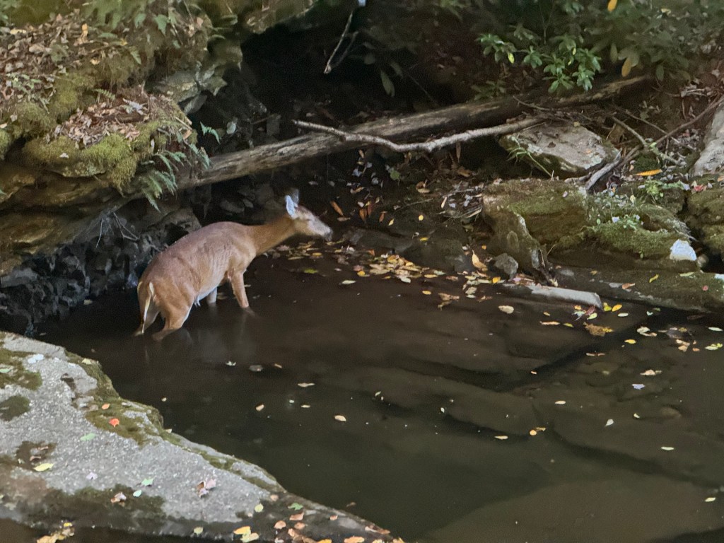 As we waited for the group to finish crossing the creek, some of us noticed that a quirky deer was walking leisurely down the trail toward us. And then, without slowing, the deer started to adjust course to its right then leaping into Seneca Creek below. The deer briefly and awkwardly ambled/swam around. Then it stopped in the water, standing completely still with its tail extended out and back. Some wondered aloud if the deer was hurt from the fall. Others speculated that it was using Seneca Creek as its toilet. Eventually it swam up out of the river and headed off.