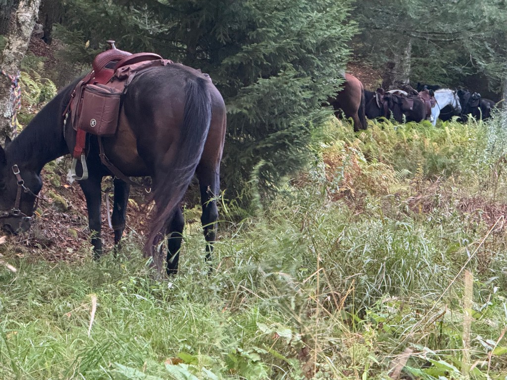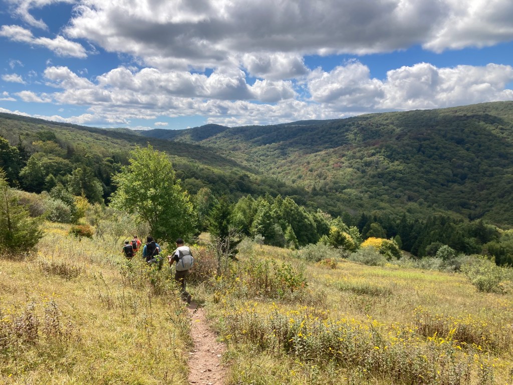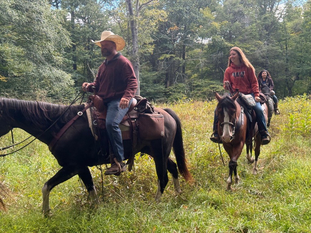 Rather than heading north at the Judy Springs trail intersection, we headed south along Seneca Creek to do a loop that picked up a couple of miles of the Allegheny Mountain Trail and added some elevation to an otherwise all-day descent. As I hiked, I could hear Aileen and Darius behind me gleefully planning their next “sufferfest”. At the top of the ridge, we saw the horses again this time with their riders mounted and with a couple of dogs trailing behind.