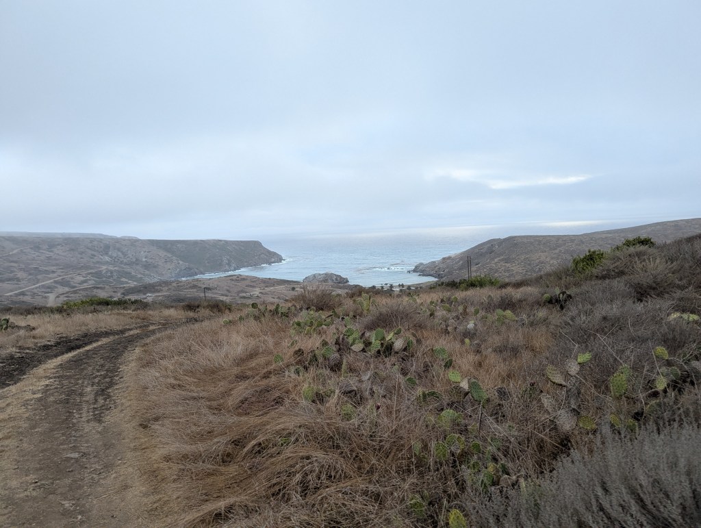 Unfortunately, not long after we were out of town, Steve and I found that we were pretty socked in without much line of sight. Although the weather forecast called for virtually no precipitation, we hiked for hours through persistent mist that slowly dampened our clothes. I decided to throw on my rain jacket to shield myself from the occasional gust. As Steve and I hiked, the trail’s loose dirt accumulated as heavy mud on the bottom of our trail runners making me feel like I was wearing clogs. Around 12 miles into the trek Steve and I arrived at Catalina Island’s “Airport in the Sky Restaurant” where we warmed up while enjoying cheeseburgers and fries. Reenergized, Steve and I finished the remaining miles towards our campsite. As we got a few miles out, the clouds started to thin and we began to be able to see the island’s beauty much better. Eventually we descended down to our campsite, the Shark Harbor section of Little Harbor campground. Shark Harbor was an incredible beach-side camping spot that I hope to visit again some day. As fair warning to future TCT hikers, although I had nothing but positive experiences there, Steve and another adjacent camper encountered some pesky flies.