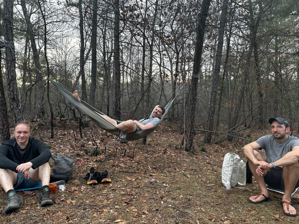 Once at the campsite at the top of Waterfall Mountain (my GPS tracked 25 miles for the day), we set up for the night and enjoyed each other’s company – and a makeshift bushcraft shelter. As is a norm for this trip, sadly, four of the original 13 hikers would call it quits after this first day. We went to bed as the temps began to rise overnight, and the second group arrived late to set up across the street on Crisman Hollow Rd.