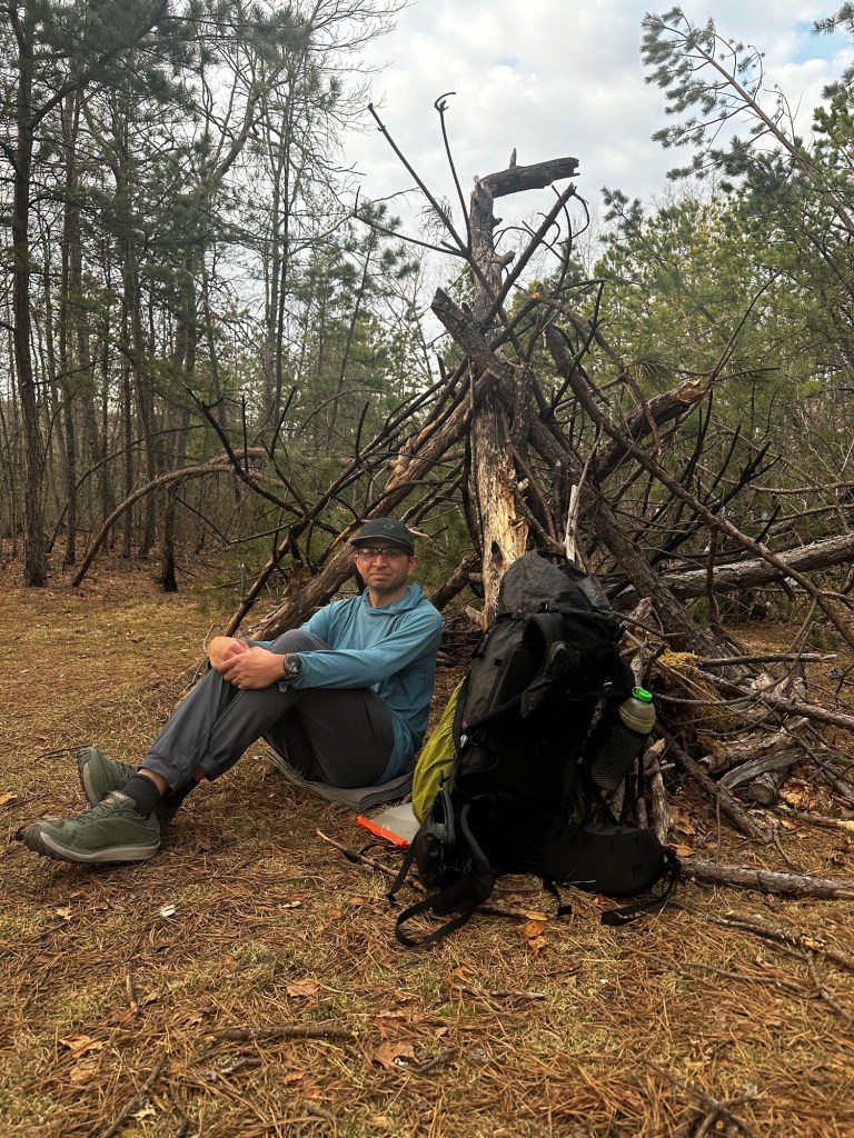 We had a small fire in the shelter firepit, though the wood supply was a little iffy. The temperature was the coldest of the weekend, with the night dipping into the 40s. Several of us were startled awake by a helicopter passing by low overhead with a searchlight. I hope they weren’t searching for my log.
