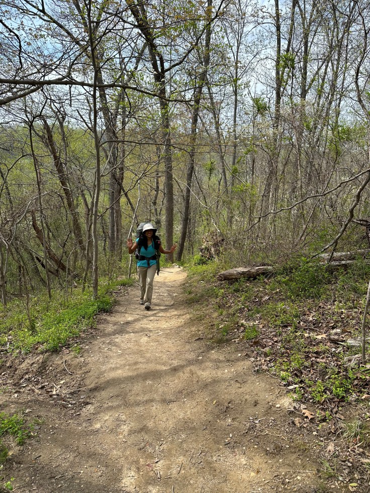 The Sunday hike was delightful. It was cool but not at all cold. After a brief climb the trail leveled out with few rocks. It was hypnotic. The original plan was to stay at Whiskey Hollow Shelter and wake early Sunday to watch the sunrise on top of Sky Meadows State Park. However, I’m no meteorologist and my plan was not practical. The hike from that shelter to the Sky Meadows overlook was over three miles, with a steep climb out from the hollow. When I last did this hike I called for a start time of 6:15 a.m. However, that trip was in December. In April, we would have needed to start at 5:15 a.m. Waking at 4:30 a.m. would have been unpleasant. It was cloudy anyway. The sunrise would not have been spectacular.