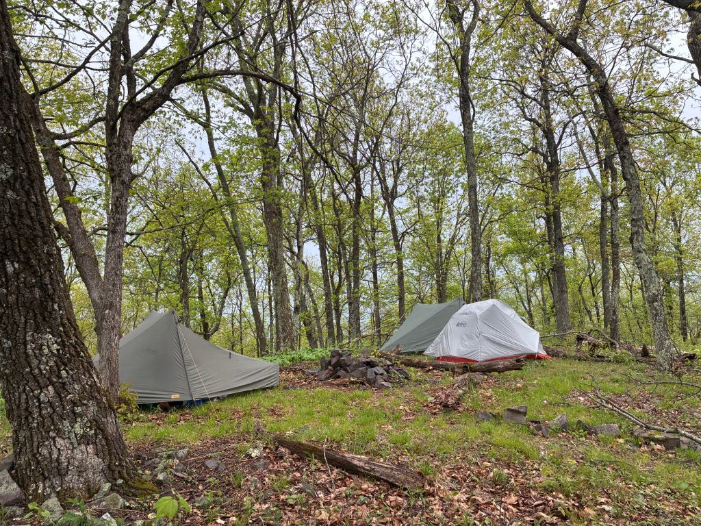 After some ridge walking and another steep climb, by about 4 pm, we had a decision to make. Parag looked up a couple of decent campsites on that stretch of the trail, all of them dry. The forecast was starting to look worse, with rain coming by 5 pm and not stopping until sometime on Sunday. There was also a potential for severe thunderstorms, although it looked like the worst of them were going to the left and right of us. Ashley and I came up on a smallish campsite that looked like it could fit our three tents. We sat down to wait for Parag and were immediately greeted by a small army of gnats who seemed to entertain themselves by trying to get in our eyes and noses. After a while they lost interest and disappeared, maybe they felt the rain coming. Parag arrived shortly and, after short deliberation, we decided it was wise to stay at the campsite instead of pushing forward. The rain was expected to start any minute and, having covered 18.5 miles with 6,300ft elevation change, we didn’t feel cheated. We found a few flat spots and barely had time to pitch our tents before it started raining. There were a few downed trees and branches around, so we were hoping for no strong winds or bad storms. Luckily, there was no wind, just steady rain, sometimes heavy, that continued from 5 pm all the way through the night. We stayed in our tents all evening, I didn’t even feel like coming out and cooking my ramen. Luckily, there was decent cell service on the ridge, so I was able to catch up on my Stanley Cup playoffs watching.