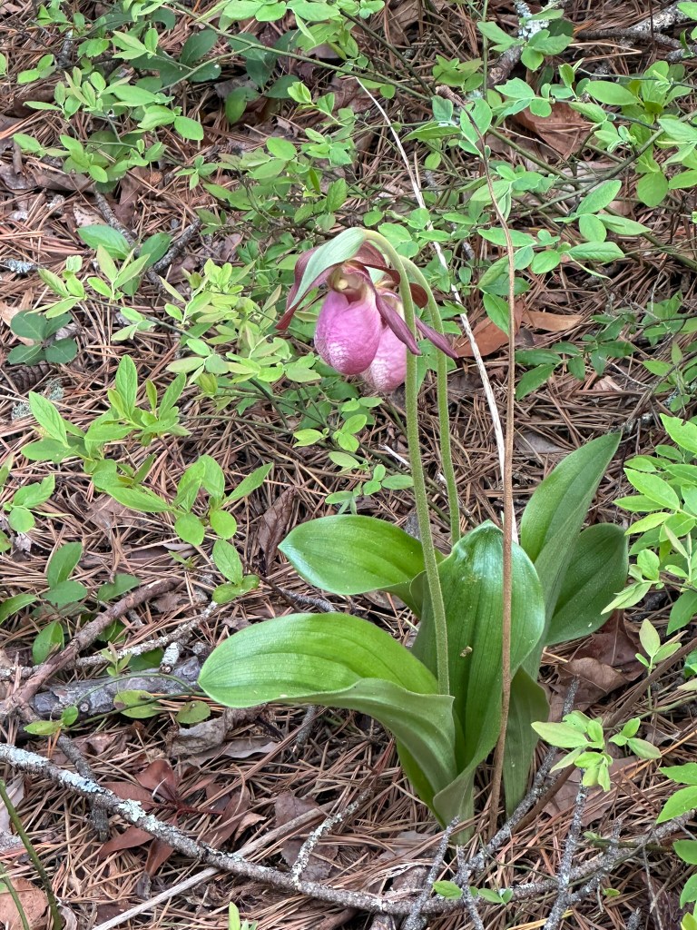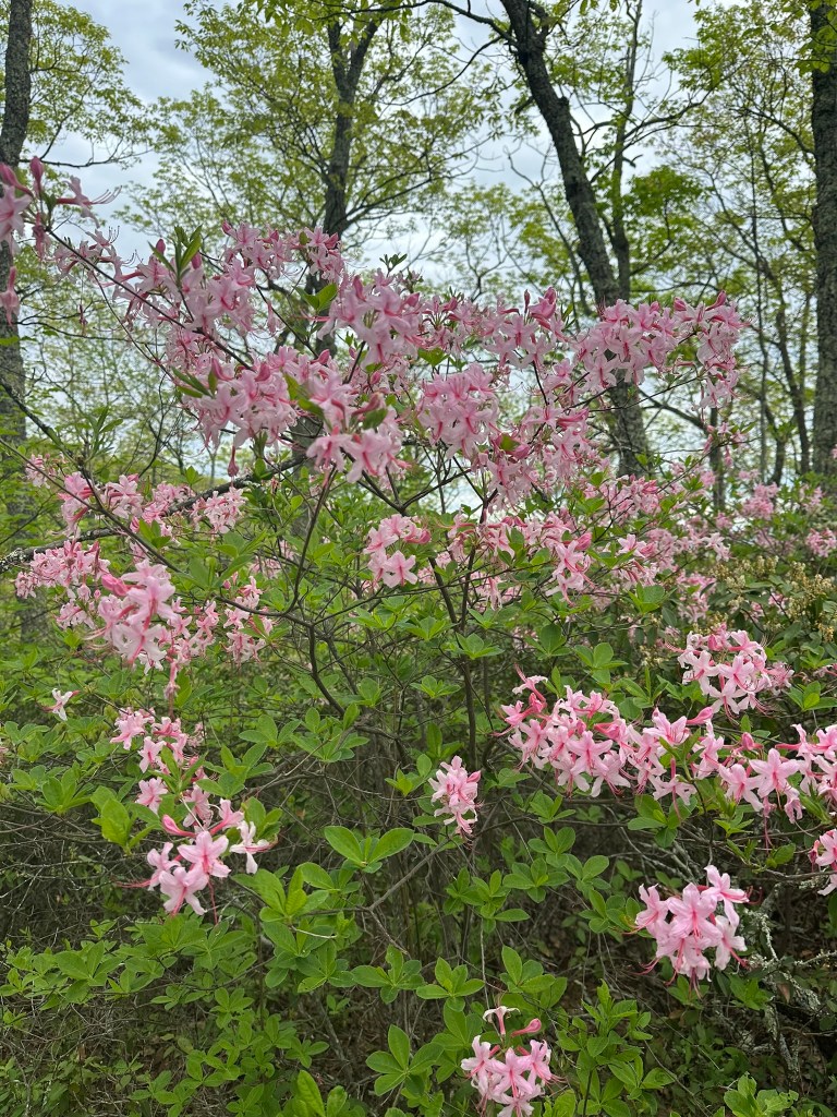 Parag, Ashley and I started the Wild Oak Trail hike at the FR 95 trailhead Saturday morning a little before 8:30 am. Ashley and Parag drove up the night before and spent Friday night at the trailhead. I left Fairfax at 6 am Saturday morning and got to the trailhead around 8 am. Originally, we planned to hike the loop clockwise, but because of potential severe thunderstorms in the forecast for Saturday afternoon and rain Sunday, I decided to reverse the route and go counterclockwise. The best views and most of the elevation change are on the stretch of the trail that passes the Little Bald Knob and the Big Bald Knob, and we didn’t want to do that part of the trail in a thunderstorm or pouring rain. Curiously, the Little Bald Knob, at 4,300ft, is 200ft higher than the Big Bald Knob at 4,100ft. Neither one is particularly bald because both of them are covered with thick vegetation at the top, so the views from the top are not the best. However, there are plenty of gorgeous views on the way up and the weather was cooperative enough for us to enjoy them. The trail is very well maintained, but very steep at times, with up to 45-degree grade. As we climbed up the trail, we passed by many blooming mountain laurels and wildflowers, including pink lady slipper orchid.