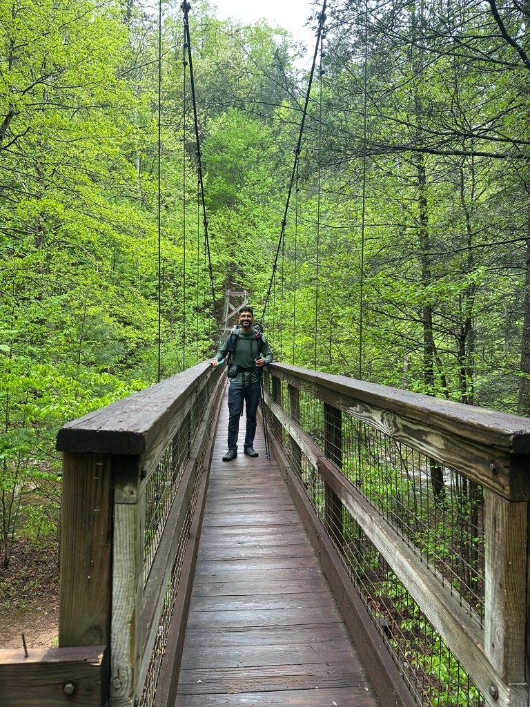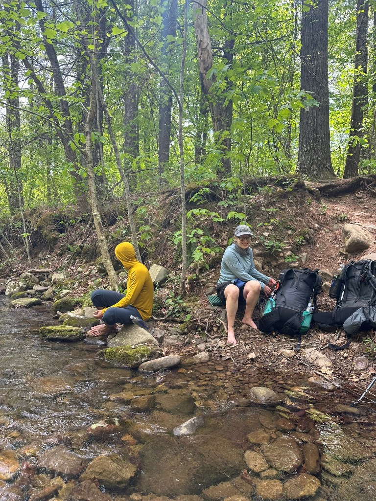 After summiting Little Bald Knob, we descended to the North River at Camp Todd. Originally, that was our campsite for the night, but because we were hiking in the opposite direction, it was just a lunch spot and an opportunity to tank up on water. Water is scarce on the Wild Oak Trail, with North River being the only reliable source. The trail crosses it twice, first time near the Rt 95 trailhead and then at Camp Todd. There are some seasonal sources and streams a short bushwack off the trail, but it’s best to fill up at the river. After Camp Todd, the trail climbs steeply up to Big Bald Knob. This is the most challenging part of the trail, with the trail climbing over 1,700ft in 2.5 miles, with grades exceeding 45 percent. The descent is almost as steep. On the way down from Big Bald Knob, Ashley realized that she didn’t have enough water for potentially dry camp that night. Luckily, Parag spotted a stream below the trail, and they were able to climb down and fill up their bottles. It was around 2 pm and the dark clouds were gathering. It started raining, but not hard and, after about 30 min of light rain, it stopped, and the sun started peeking out.