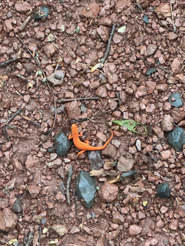 I woke up at 5:30 am and checked the Weather Channel, not feeling too hopeful about the weather. To my delight, the forecast changed, and all the rain was supposed to clear out by 7 am. We waited in our tents until the rain stopped and then packed up. Unfortunately, Parag’s tent let in some water and his gear got wet overnight. I think there may be a Durston X-Mid in his future. We got back on the trail before 7:30 am. It was a bit late for 10 before 10, but we did not aspire to setting any DCUL speed records. After a lot of climbing the previous day, it was a very easy 10 miles, with only around 1,000ft ascent. The trail was a mix of wooded single track and old forest roads, with a few rocky sections thrown in. We walked past a few large puddles populated by tadpoles and then hit the “salamander highway”. At least we initially thought they were salamanders, but the little creatures turned out to be juvenile red-spotted newts. They adorably sat in the middle of the trail, blissfully unaware of passing DCULers who are known for flattening their amphibian relatives (RIP Kermit of the C&O Canal tow path). Ashley entertained us counting the baby newts. By the time we reached the end of the trail, she counted 22 of them.