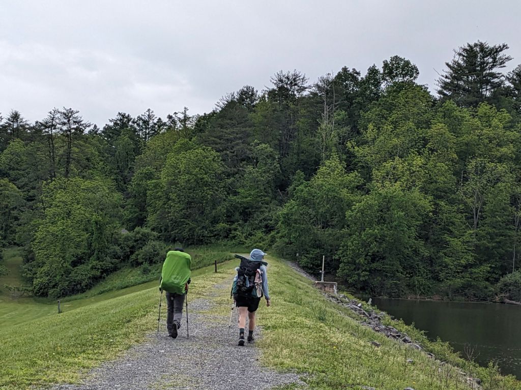 We ended the road walk at Stone Valley Recreation Area. It had a summer camp vibe, with rock climbing and ropes courses in view. We lunched at a picnic table by the lake. Ashley demonstrated another pro tip by eating snacks from a bag with a long spoon, which I thought of as I washed pretzel seasoning dust off my hands in the lake. I also had fresh blueberries and an orange, a nice treat, but what I really wished I had was a beer to go with the lake view (“toes in the water,” etc.).