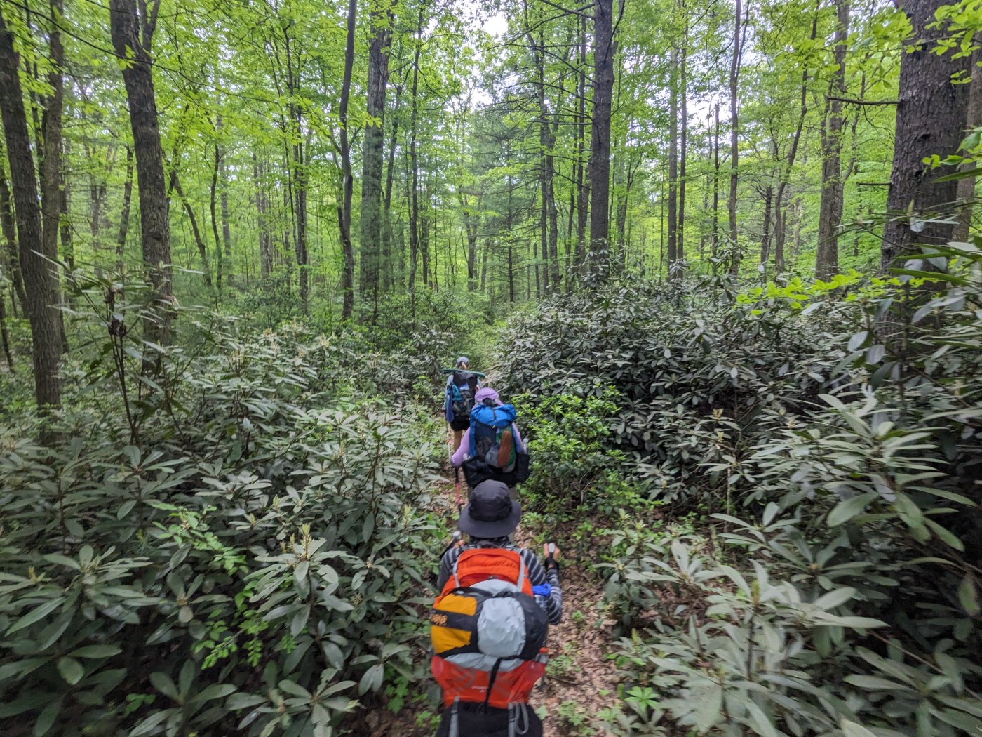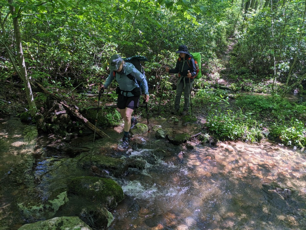 On Friday Ashley and I left DC in the early afternoon to beat traffic. The forecast looked amazing, and I got more excited as we passed through the countryside under deep blue skies with puffy clouds. A quick stop at a Sheetz in Huntingdon, and soon we were at the trailhead at the end of Frew Road (no flooded roads, thankfully). While waiting in the parking lot, Ashley showed off her resourcefulness and helped repair a rip in my Frogg Toggs jacket (pro tip: get an ultralight sewing kit!). Lily and Renae, coming from Cleveland, arrived soon after. They are both part of a group of serious hikers in Ohio whose members now frequent our DC UL trips. They’re also joining me on the Wonderland Trail later this summer and were eager to use this as a training trip.
